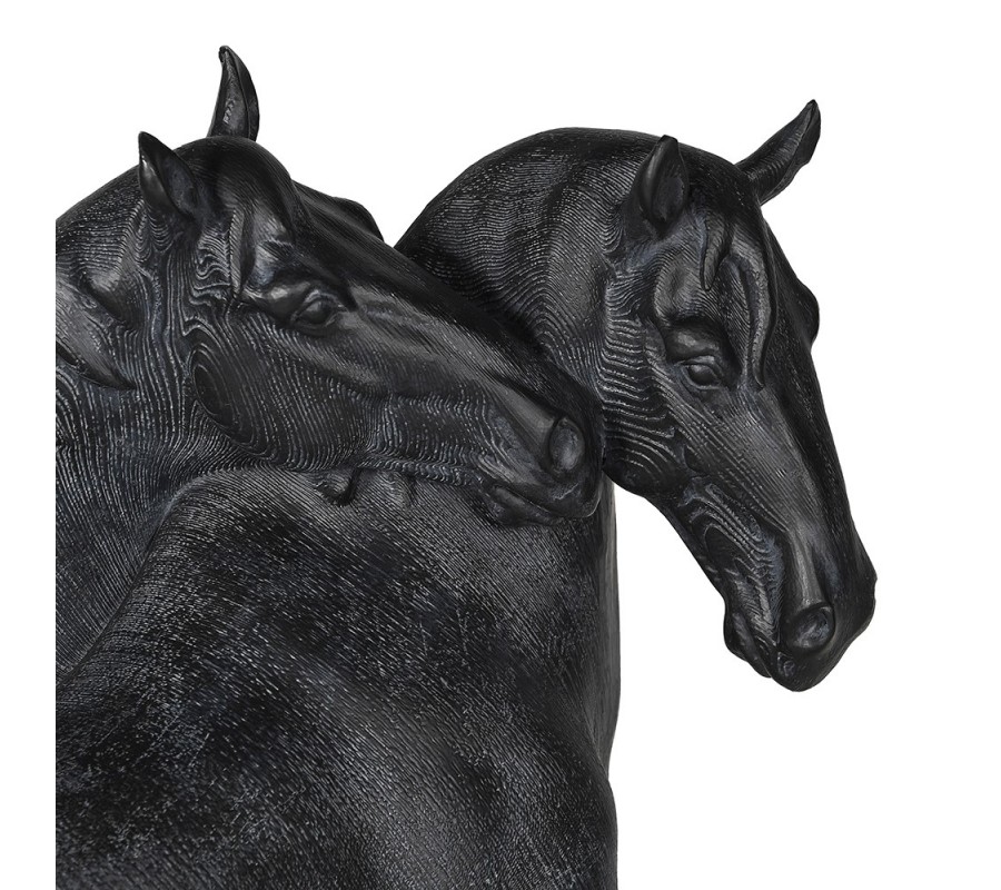 Štýlová dekoratívna socha dvoch konských hláv Gatern v elegantnej matnej čiernej farbe pôsobí výrazne, umelecky a nadčasovo. Dve hlavy koní sú spracované v dynamickom, takmer sochárskom geste – mierne pootočené, s naznačeným napätím svalov a energiou pohybu, vďaka čomu dekorácia evokuje silu, noblesu a slobodu. Povrch nie je úplne hladký; jemná textúra dodáva soche hĺbku a robí ju vizuálne zaujímavou z každého uhla pohľadu.