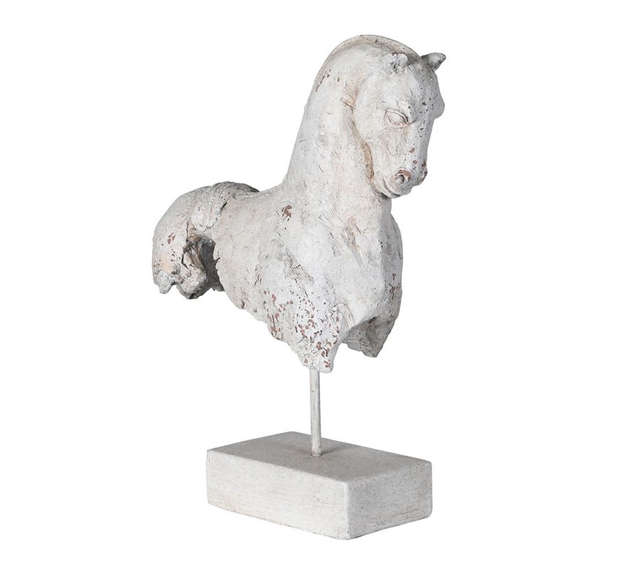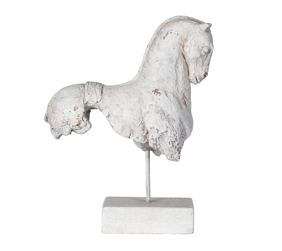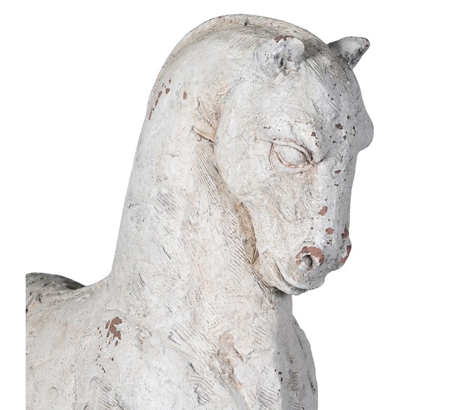 Dizajnová socha Gerant v podobe koňa zaujme jemným kamenným výrazom a decentne ošúchanou patinou, ktorá jej dodáva autentický, nadčasový charakter. Matná biela povrchová úprava pôsobí prirodzene a elegantne zároveň – ako svetlý kameň s jemnými stopami času.