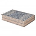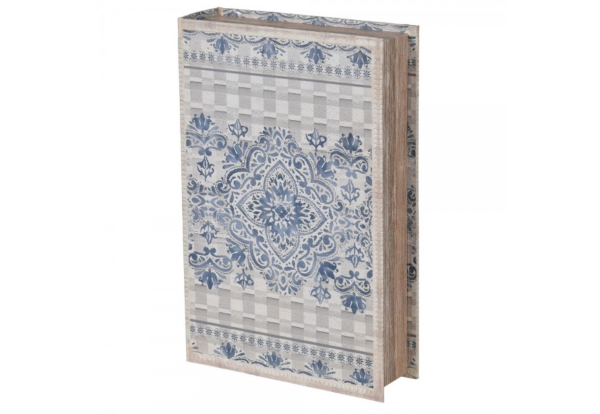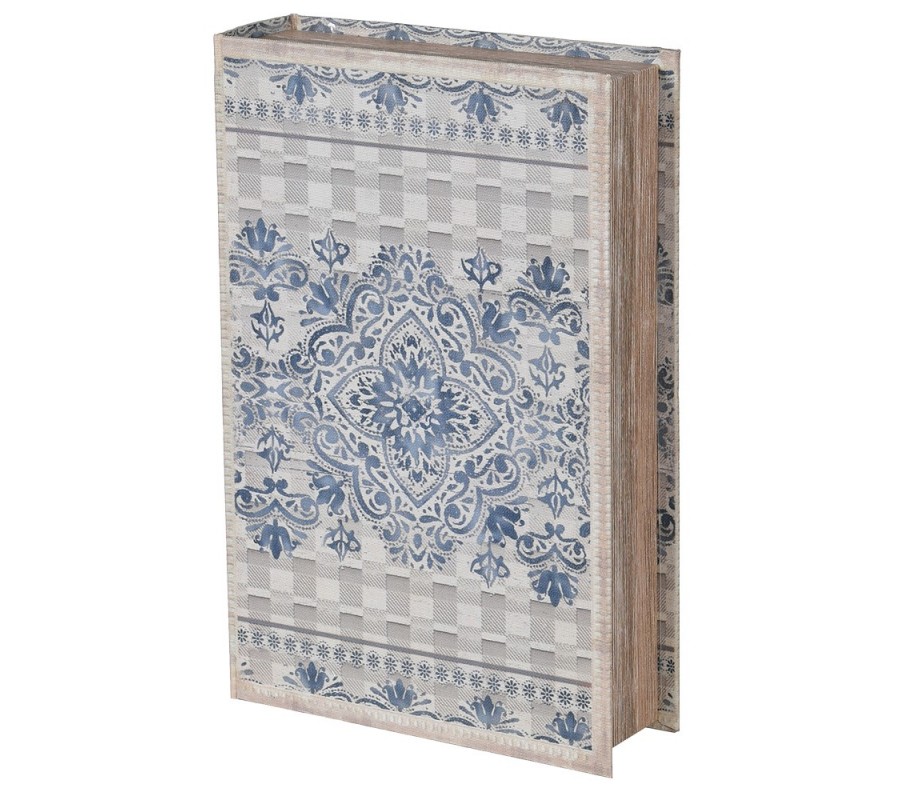 Dizajnová vintage krabička Azulea v tvare knihy s ľanovým poťahom s modro-sivým ornamentálnym vzorom 33 cm
