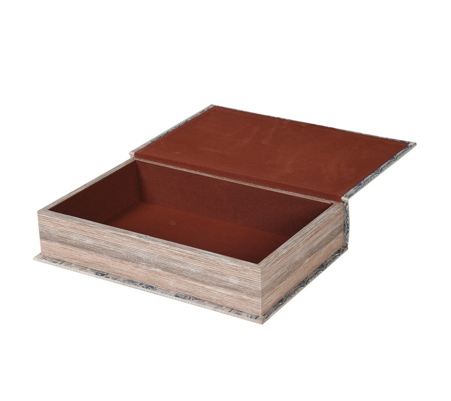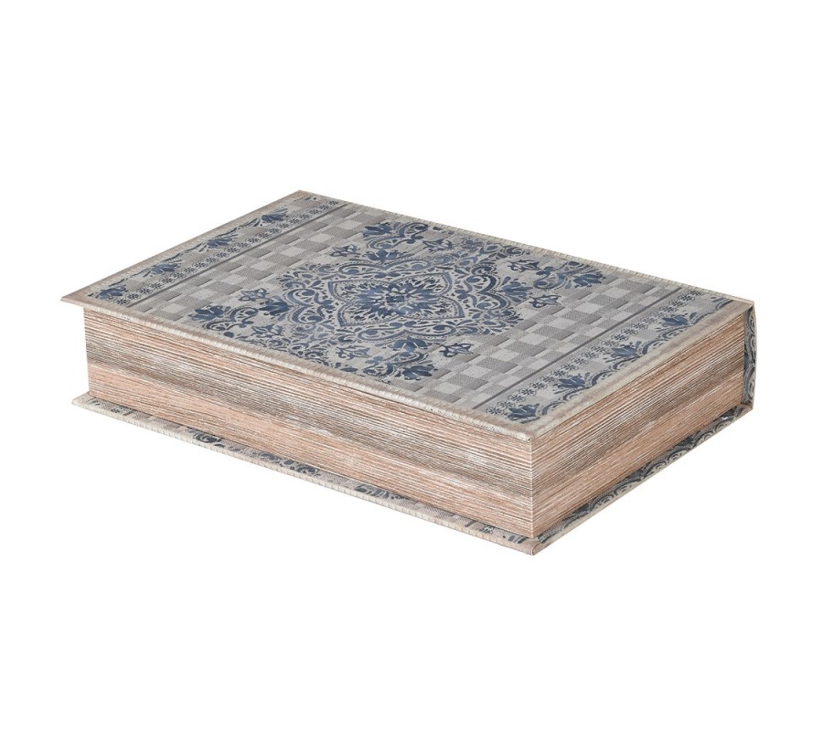 Krabička je vyrobená z MDF dyhy a jej povrch zdobí ľanový poťah. Autentický tvar knihy jej dodáva prečnievajúca vrchná a spodná doska a jemný lineárny reliéf na bokoch, pripomínajúci stránky knihy. Svetlá modrá a sivá farba vytvárajú elegantnú farebnú paletu a vyblednutý efekt dodáva krabičke štýlový vintage nádych. Ornamentálny vzor zachytáva florálny motív, ktorý v kombinácii s modrou farbou pripomína stredomorskú bohato zdobenú keramiku.
