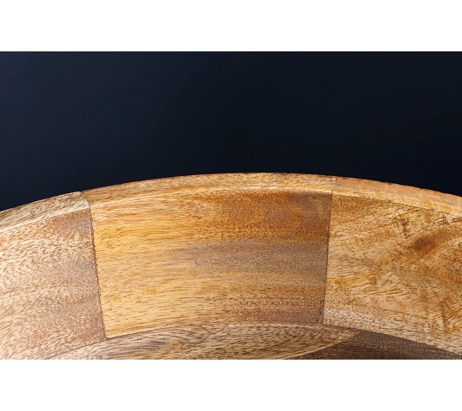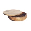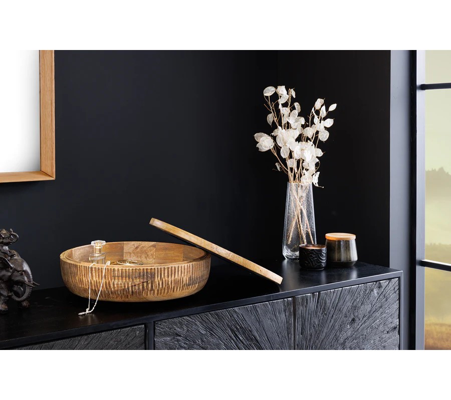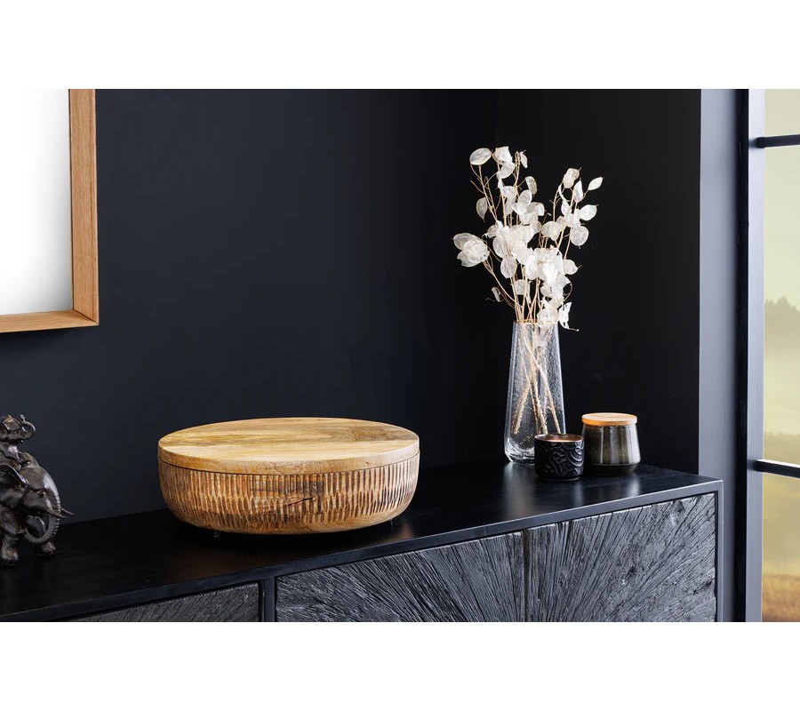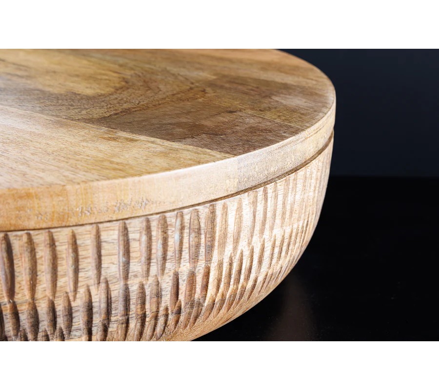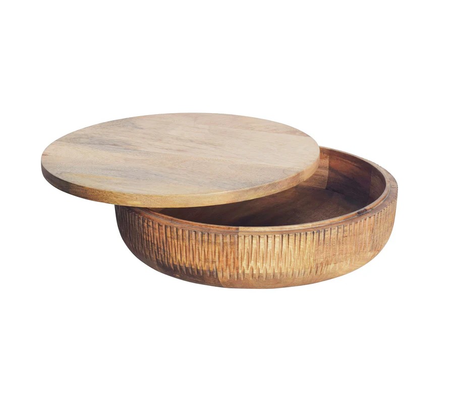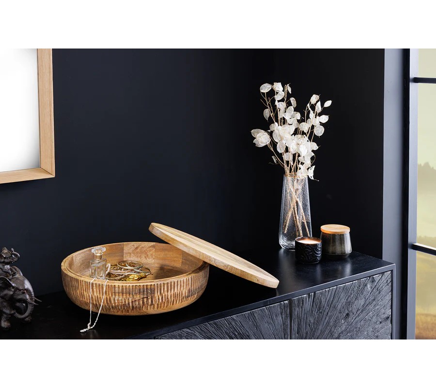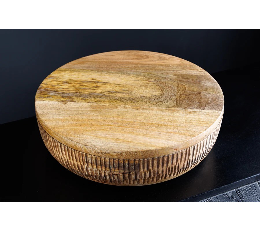 Dizajnová okrúhla drevená misa s vrchnákom Sally z mangového dreva s vyrezávaním 38 cm