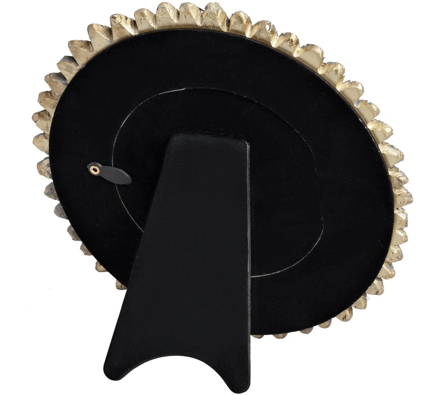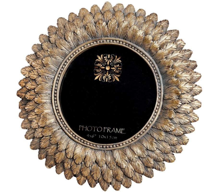 Rám je vyrobený zo živice, čo umožňuje detailné spracovanie dizajnu. Presklená stredná plocha na umiestnenie fotografie je okrúhla a obklopujú ju tri vrstvy pierok s výrazne definovanými líniami, vďaka ktorým pôsobia dynamickým dojmom. Prevedenie v starožitnej zlatej farbe s jemnou patinou dodáva rámčeku nádych nostalgie. Zadná strana má čiernu farbu so skladacím stojanom.