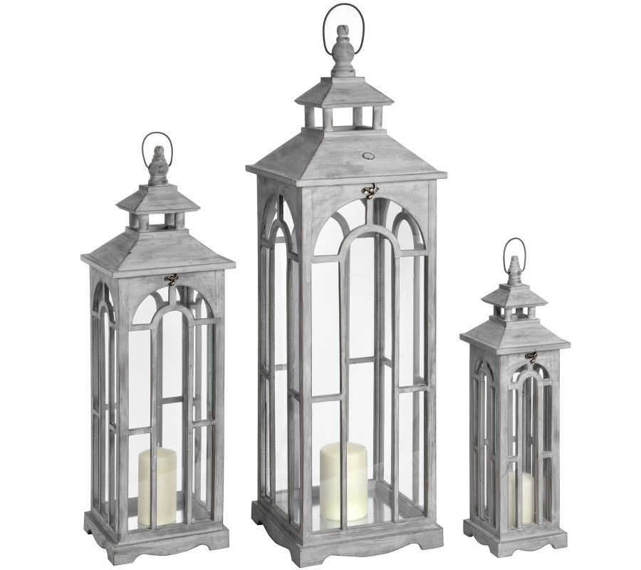Sada obsahuje tri svietniky rozličných veľkostí, najväčší s podstavou s rozmermi 31x31 cm a výškou 104 cm. Svietniky majú identický dizajn a vysokú štíhlu siluetu, ktorá sa smerom nahor mierne zužuje a je zakončená strieškou osadenou na štyroch nožičkách. Vo vrchnej časti je umiestnená oblo tvarovaná vežička s okrúhlou kovovou úchytkou. Strany svietnika majú dizajn klenutého tabuľového okna, so sklenenou výplňou umiestnenou v drevenom ráme. Drevo je ošetrené matným sivým náterom s jemnou patinou, ktorá mu dodáva nádych vintage štýlu.