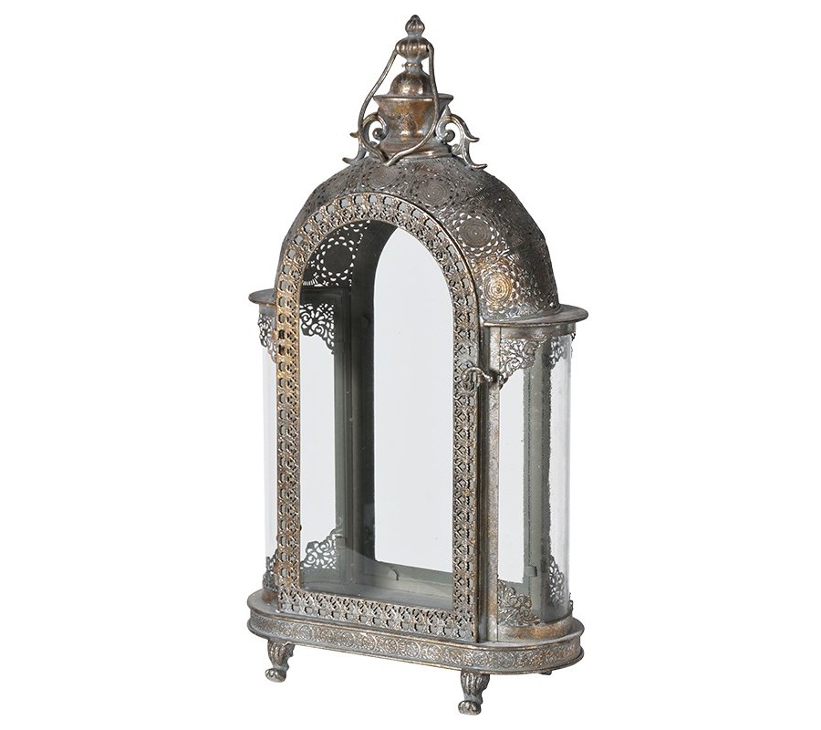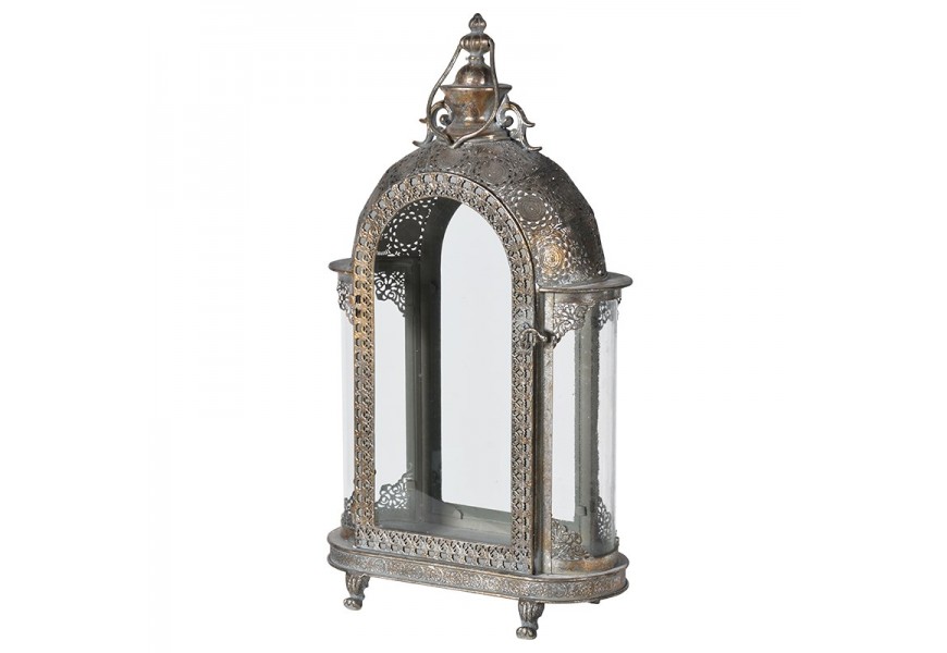 Dizajnový vintage lampáš Surya s ornamentálnym zdobením a oblúkovým vrcholom s efektom zostarnutia zlatá strieborná 62 cm