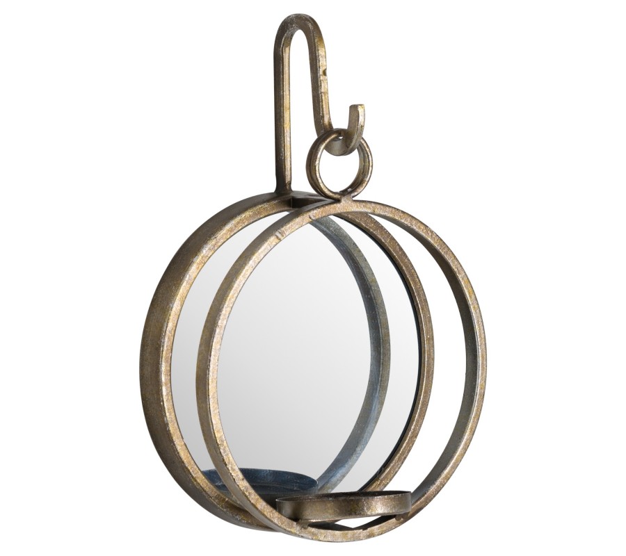 Tento atypický závesný svietnik doplnený o praktické zrkadlo svojim nevšedným vzhľadom zaujme na prvý pohľad. Okrúhla bronzová konštrukcia je doplnená o patinu, a tak svietnik získava autentický, starožitný vzhľad. Svietnik sa svojim vzhľadom hodí do akokoľvek zariadených interiérov, od rustikálnych alebo vintage až po moderné, ktorým dodá nevšedný a zaujímavý prvok.