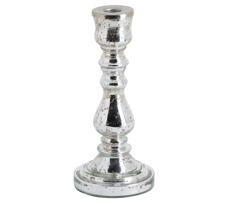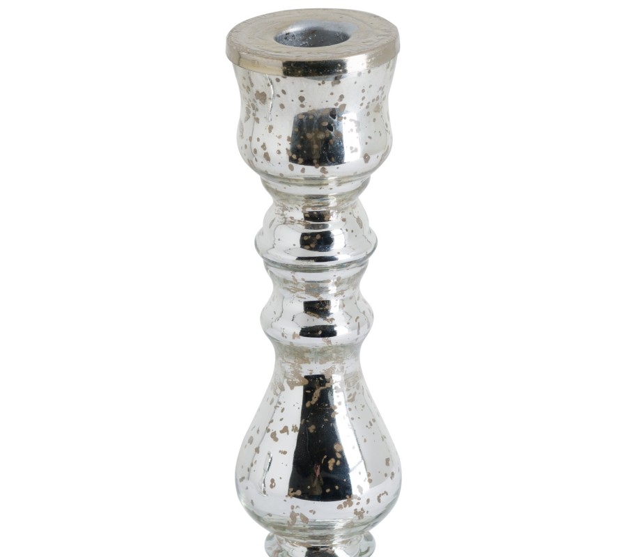 Luxusný sklený svietnik v striebornej farbe so zaujímavou patinou, ktorý svojim originálnym vzhľadom vo vintage nádychu ozvláštni akýkoľvek interiér.