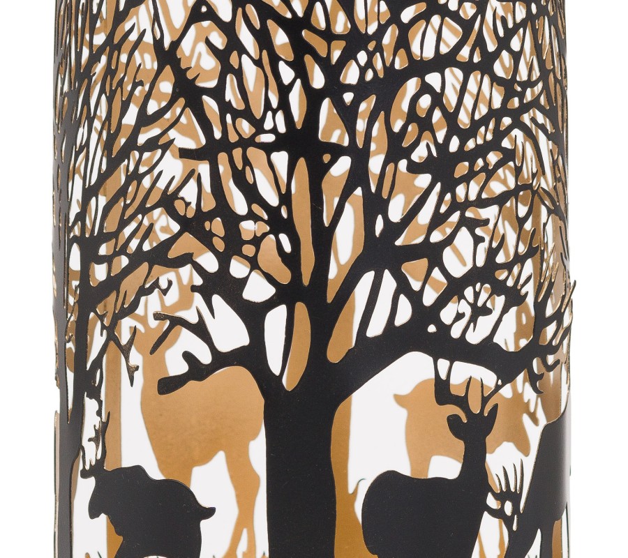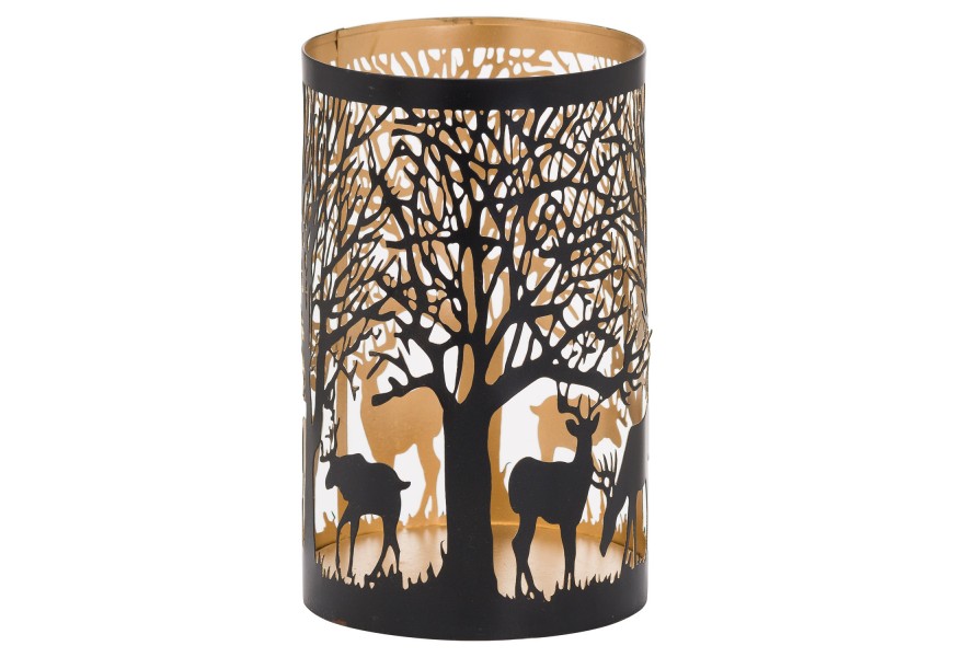 Jedinečný dizajnový lampáš Torbeo I s kruhovou podstavou je štýlovým doplnkom do vašich domácností, ktorý vám zaručene vyčarí úsmev na tvári a spríjemní vaše chvíle oddychu. Vyrezávané lesné motívy stromov a jeleňov do vášho interiéru prinesú nádych prírody. Lampáš je vyrobený z kovového materiálu, pričom vonkajší povrch sa nesie v čiernej farbe a vnútro je zlaté. Táto kombinácia skvelo vynikne najmä v art-deco ladených priestoroch, ale keďže ide o vkusnú a štýlovú dekoráciu, možno ju umiestniť skutočne kamkoľvek. Lampáš Torbeo I možno umiestniť do obývačiek, väčších chodieb, hál, či terasových priestorov.