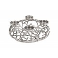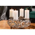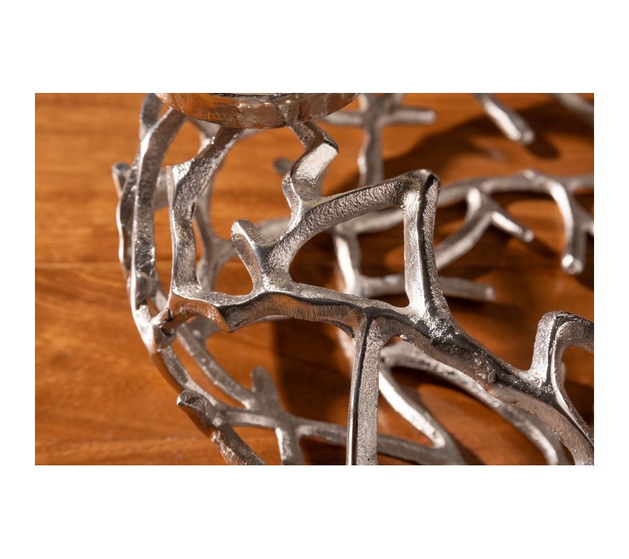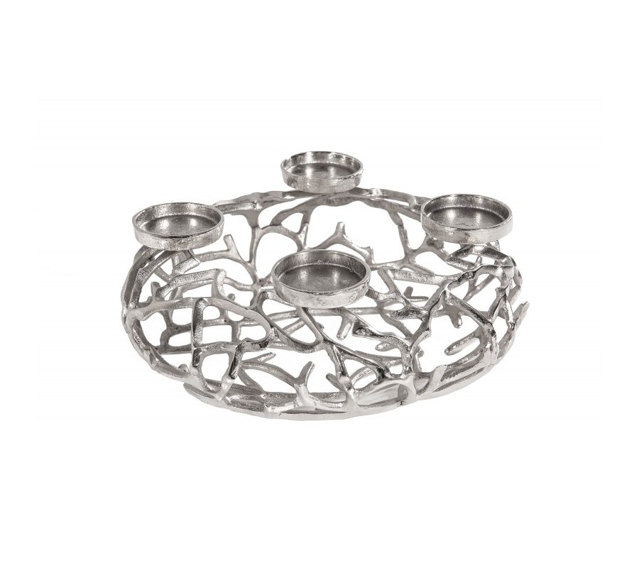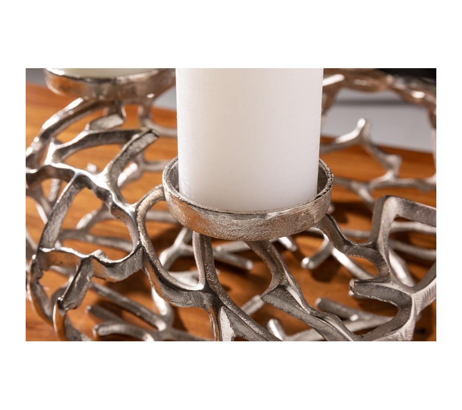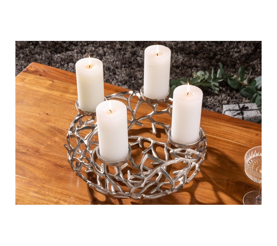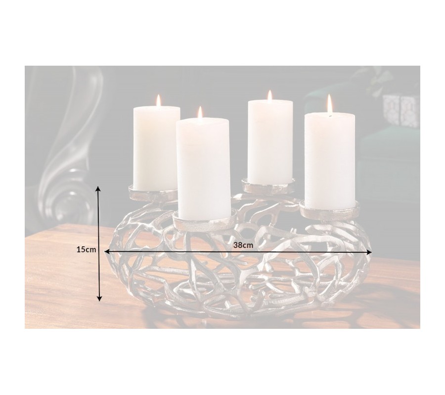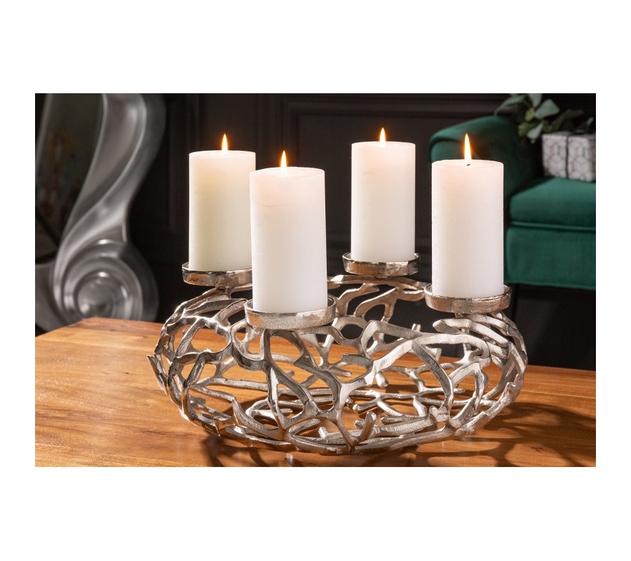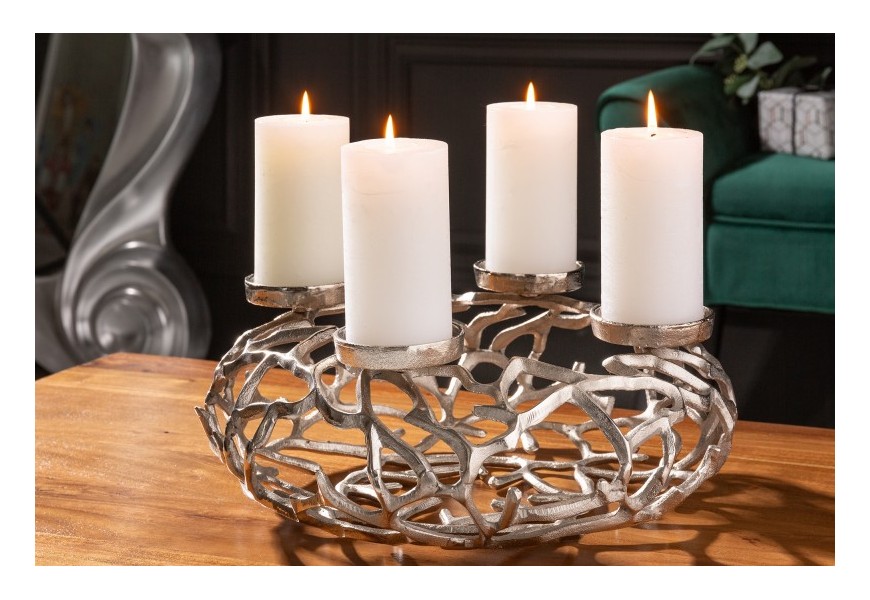 Dizajnový svietnik Llanta je štýlovým doplnkom vhodným do každého moderného interiéru. Je vyrobený z kovu v striebornej farbe a jeho kruhový tvar a zaujímavé organické členenie ho činí jedinečným doplnkom, ktorý zručene upúta pozornosť. Svietnik je vhodný na štyri sviečky, preto je skvelý aj ako moderná verzia adventného venca. Vďaka elegantnému a nadčasovému vzhľad ho však možno využiť ako celoročnú dekoráciu. Odporúčame svietnik Llanta kombinovať s nábytkom a doplnkami v art-deco alebo orientálnom štýle.