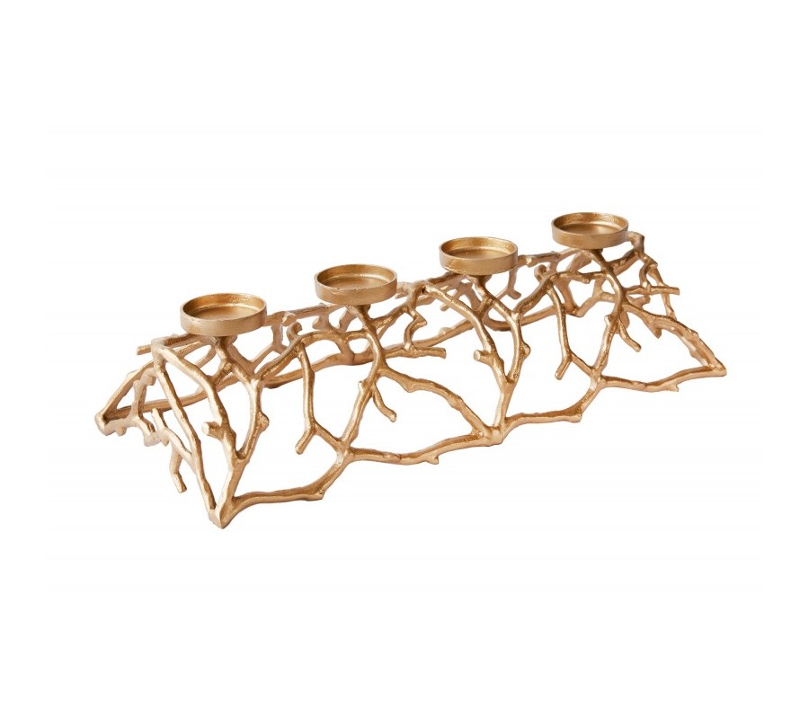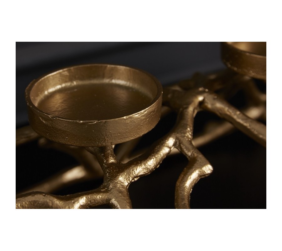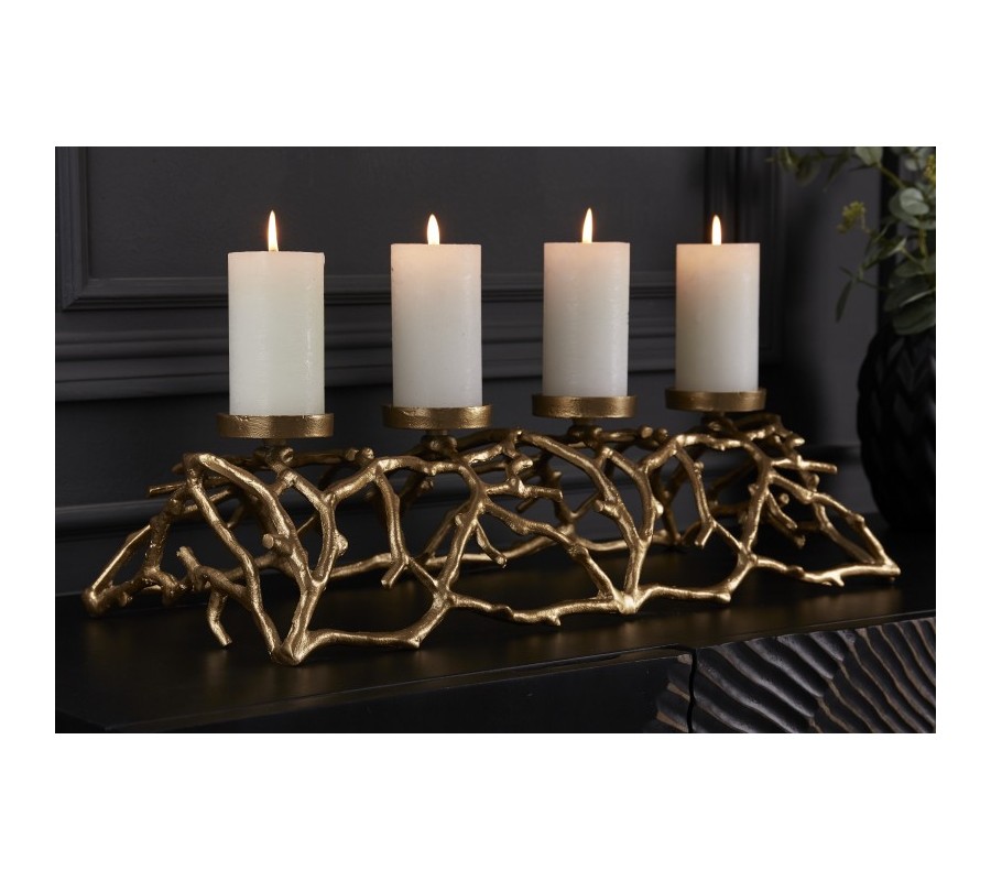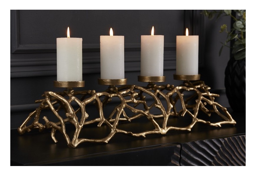 Ak hľadáte štýlový doplnok do vášho moderného interiéru, ste na správnom mieste! Dizajnový svietnik Cuerna je skvelou dekoráciou vhodnou na doplnenie jedálenského či konferenčného stolíka, dizajnovej komody či príborníka v moderne ladených obývačkách, jedálňach či iných priestoroch. Svietnik je vyrobený z kovovej zliatiny a nesie sa v žiarivej zlatej farbe, ktorá vo vašich priestoroch vytvorí luxusný nádych. Zaujímavý tvar pripomínajúci parožie či konáre stromu zaujme už na prvý pohľad a skvelo dotvorí moderný nádych vášho interiéru. Svietnik disponuje podstavcami na štyri sviece, a tak môže vhodne poslúžiť napríklad aj v čase adventu pre tých, ktorí majú radi nekonvenčnú a minimalistickú výzdobu.