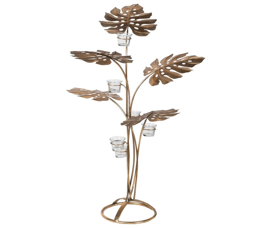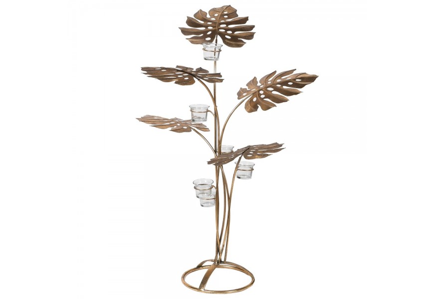 Zlatý art-deco svietnik Wenis s tropickými listami z kovu a sklenenými držiakmi na sviečky 83 cm