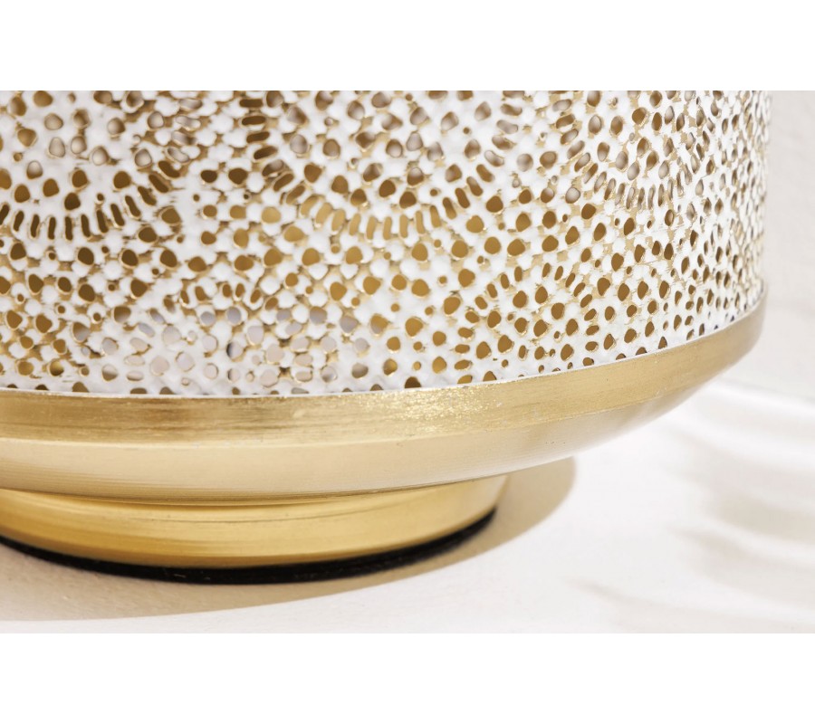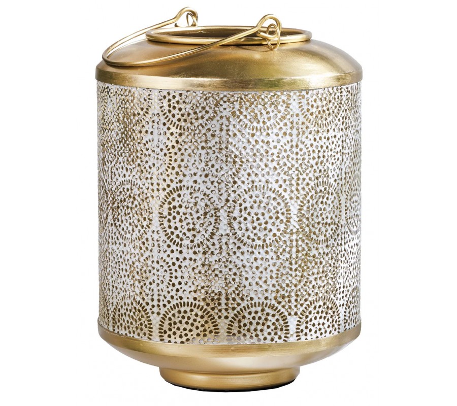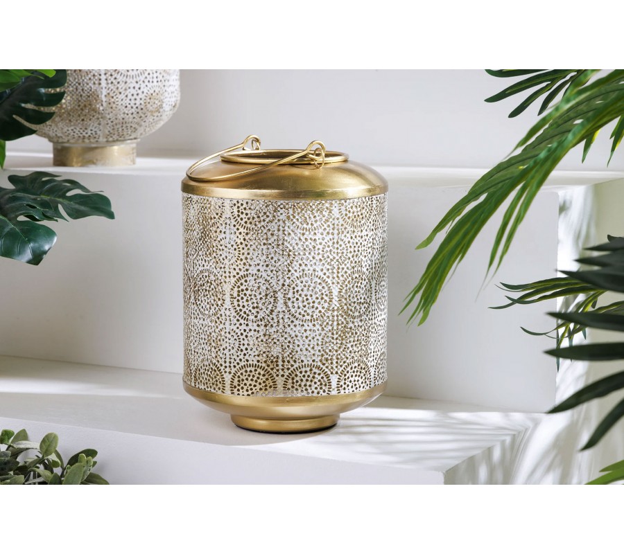 Okrúhly lampáš Sahar je dokonalým doplnkom pre vytvorenie útulnej atmosféry. Je vyrobený z kovu v zlatej farbe s dizajnovou patinou, ktorá mu dodáva starožitný nádych. Jeho povrch zdobí jemná perforácia v podobe dekoratívnych ornamentov v orientálnom štýle.