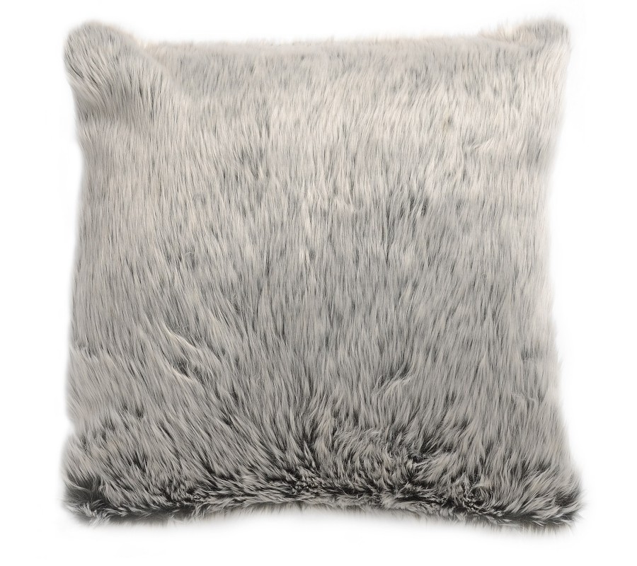 Dekoračný vankúš z umelej kožušiny v šedej farbe.