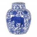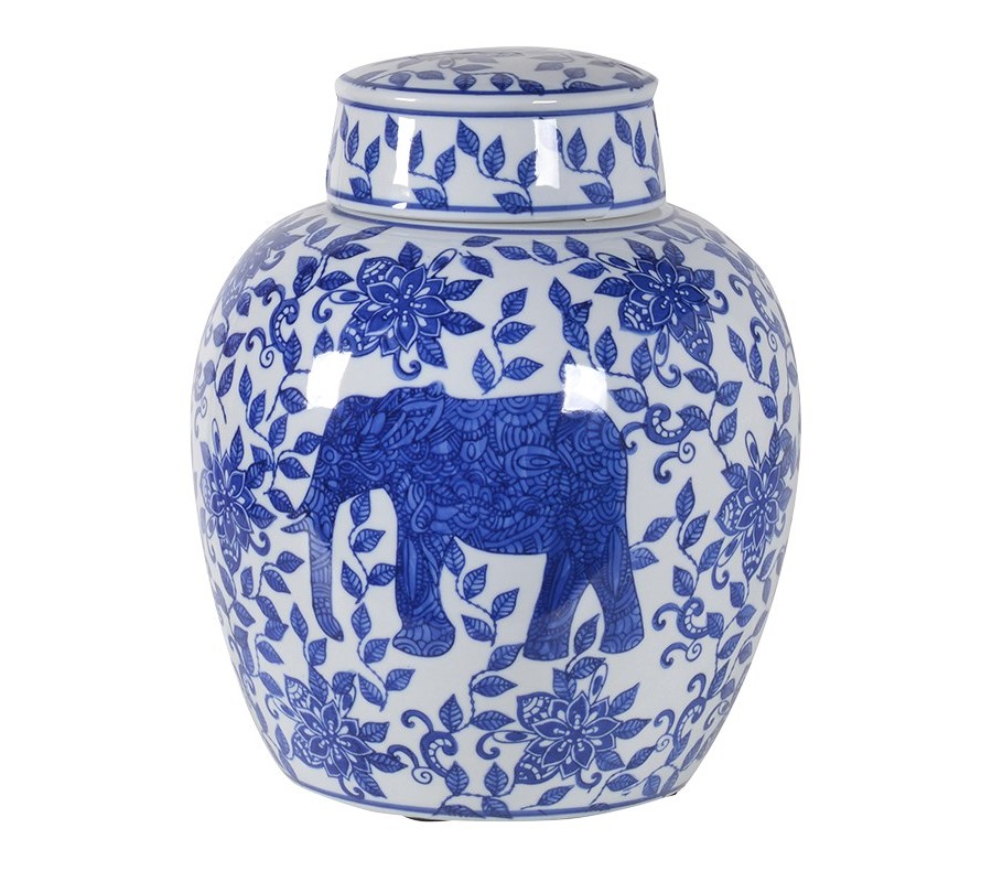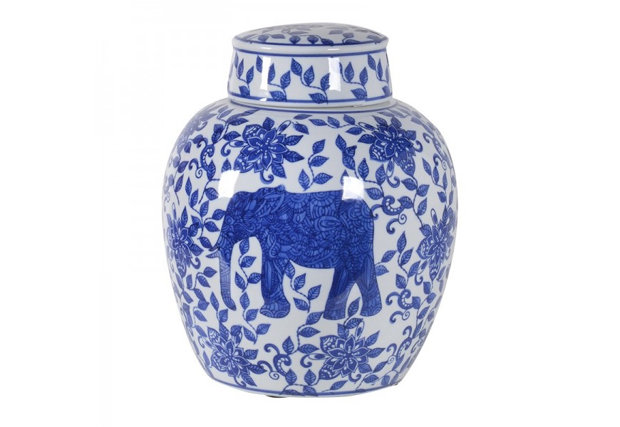Dizajnová etno keramická uzatvárateľná nádoba Haldia s ručne maľovaným motívom slona a kvetín v bielej a modrej farbe 26 cm