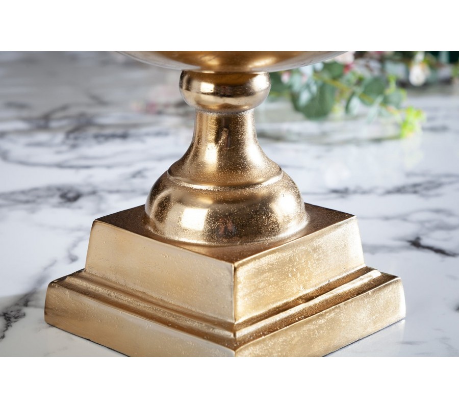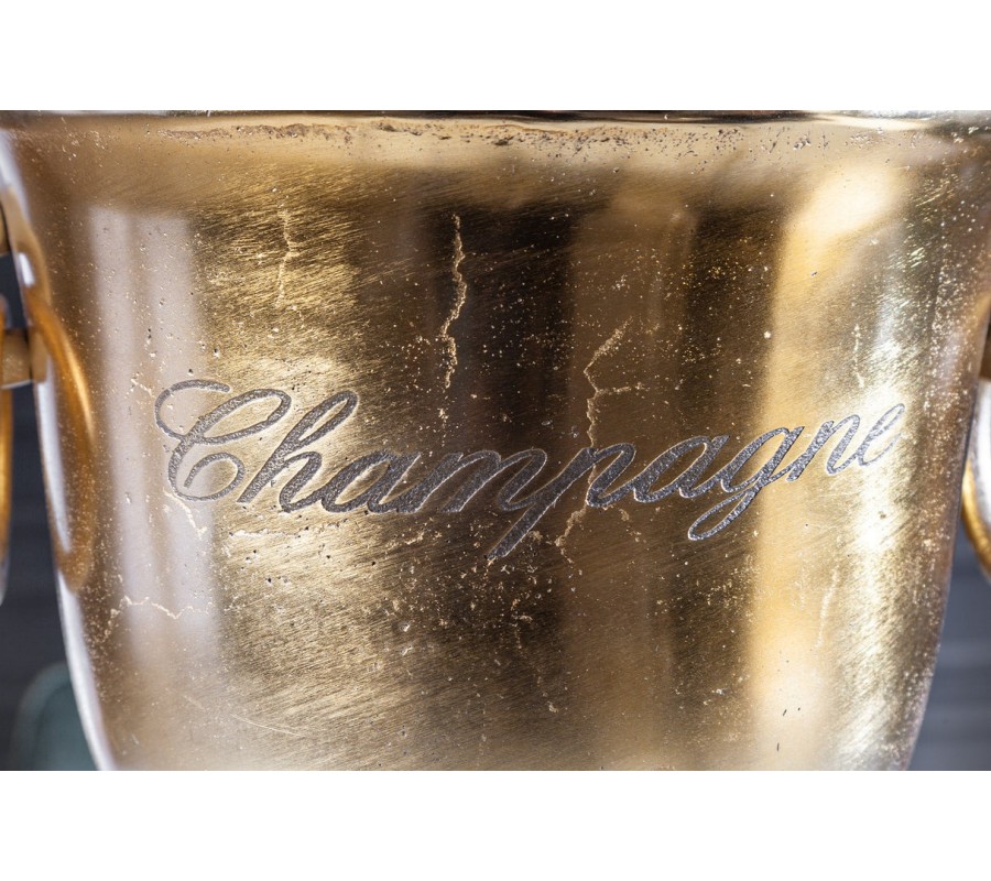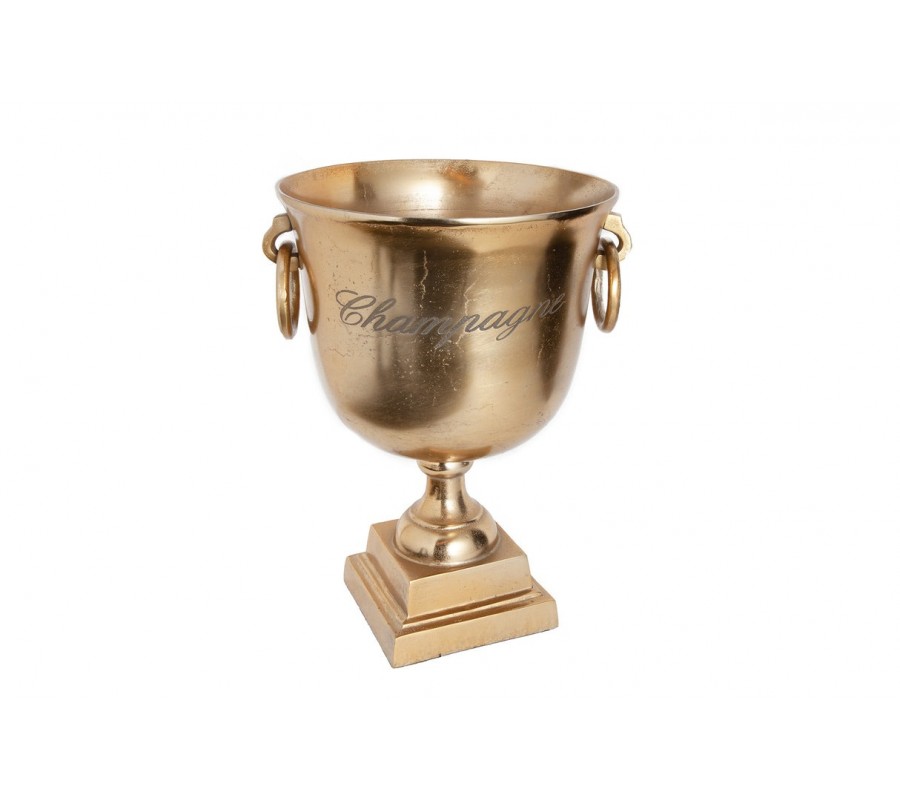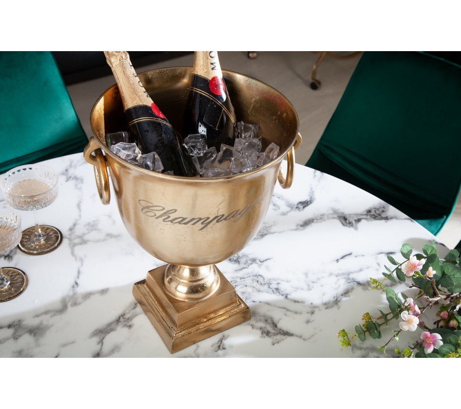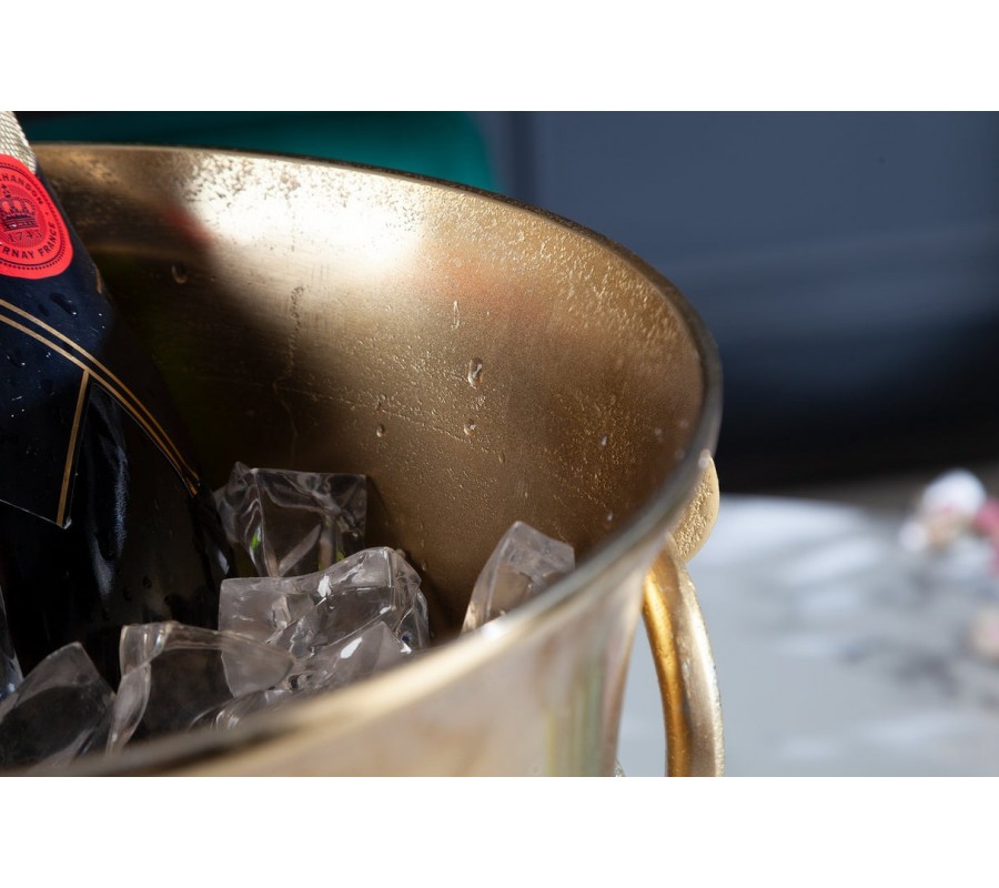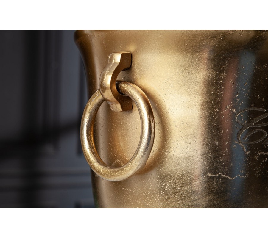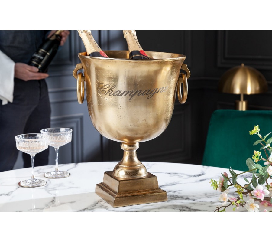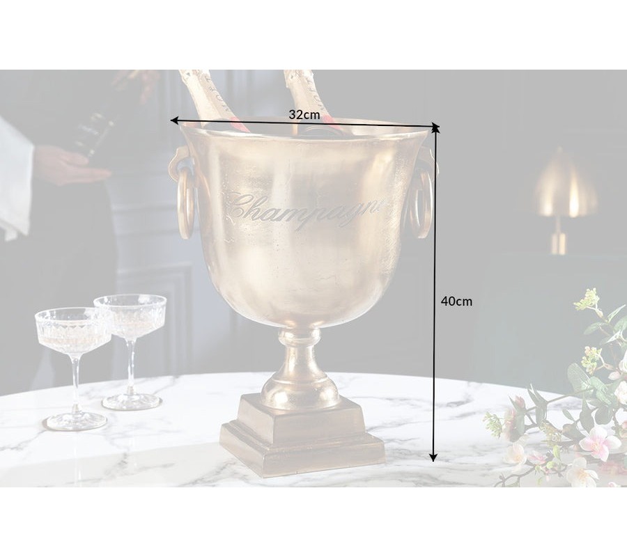 Náadoba Champagne Royal je elegantná dekoratívna nádoba s ušľachtilým dizajnom, ktorý pripomína šľachtickú slávnosť alebo exkluzívne bankety. Je vyrobená z kovu v luxusnom zlatom prevedení s jemne patinovaným povrchom, ktorý pôsobí historizujúcim dojmom a zároveň zachováva glamour lesk.