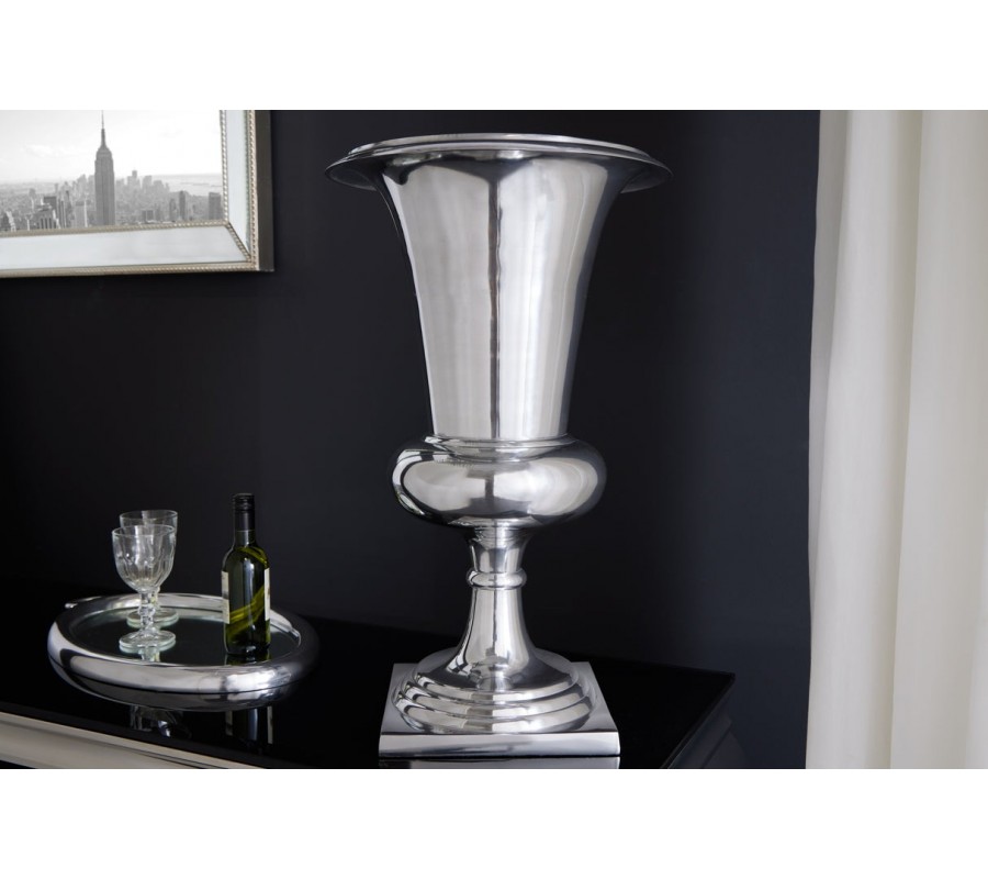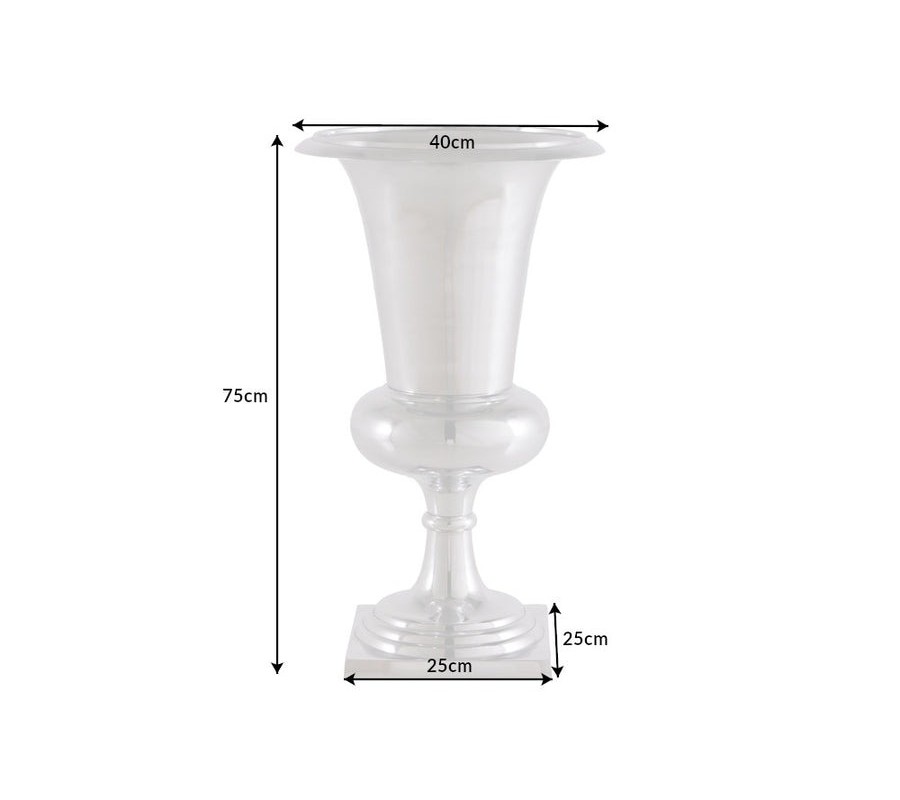 Glamour lesklá strieborná kovová dekoračná váza Celeste s vytočeným okrajom a reliéfnym podstavcom 75 cm