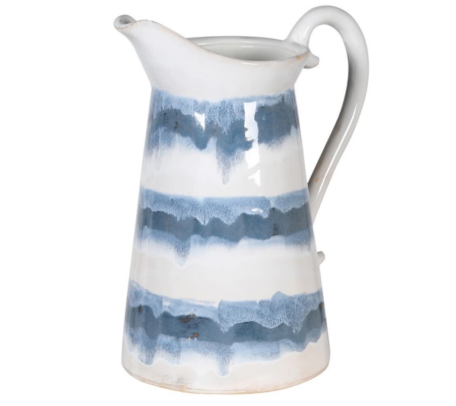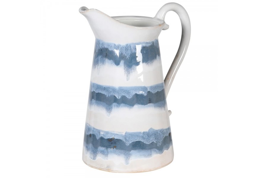 Džbán Limoges je krásnym príkladom vidieckeho rustikálneho štýlu, ktorý zaujme svojím tradičným tvarom a dekoratívnym glazovaným povrchom. Vyrobený je z keramiky s bielym základom, ktorý zdobia vodorovné pruhy v rôznych odtieňoch modrej. Glazúra je nanesená s jemným zatekaním, čo vytvára umelecký a remeselne pôsobiaci efekt s autentickým dojmom ručného spracovania.