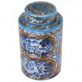 Táto dóza s vekom je  ručne vyrobená z keramiky a jej pestrofarebné maľované zdobenie pripomína taliansku majoliku.