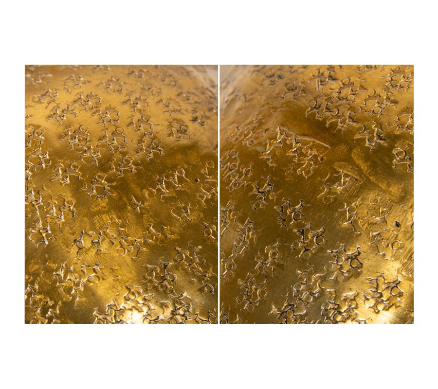 Jedinečný set kovových váz Retrivee si s istotou zamilujete. Okrem dynamického tvaru vás na prvý pohľad zaujmú svojim povrchom s dekoratívnym kladivkovým efektom, ktorý miestami pôsobí ako praskliny. Celkovo tak vázy pôsobia honosným dojmom a ozvláštnia každú miestnosť. Vďaka rozličným rozmerom vázy dokonale vyniknú umiestnené spolu ako set, nestratia sa však ani samostatne na rozličných miestach, ktoré im vo svojom interiéri vyčleníte. Výška väčšej vázy je 33 cm s priemerom 26 cm a váza s menším priemerom 21 cm má výšku 27 cm.
