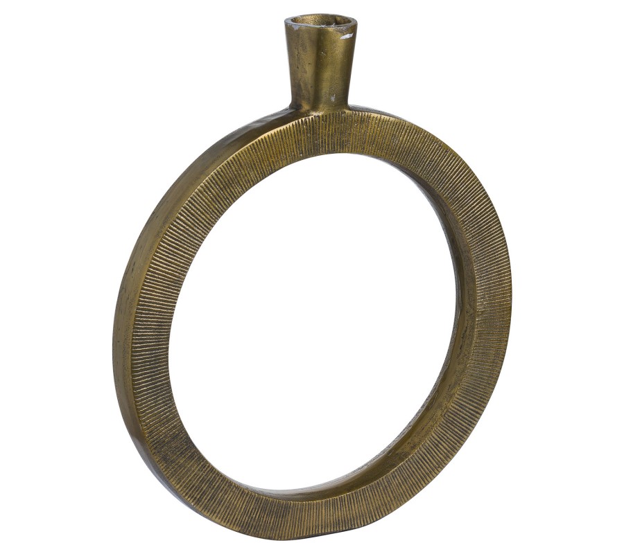 Štýlová dekoratívna váza Rueda II sa stane dokonalým doplnením vašich orientálnych, Art-deco či moderných dizajnových interiérov. Vďaka svojmu geometrickému kruhovému tvaru a kovovému vzhľadu sa veľmi ľahko kombinuje s inými doplnkami v rozličných materiáloch a farebných odtieňoch. Jedinečný kruhový tvar vázy, doplnený vašim obľúbeným kvetom, krásne vynikne umiestnený ako dominantný prvok na úzkej konzole v hale a predsieni, či ako dekorácia jedálenského a konferenčného stola vo vašej domácnosti. Kov s mosadzným povrchom môžete kombinovať s akýmikoľvek farbami, krásne vynikne v kombinácii so zafírovou modrou či smaragdovou zelenou.