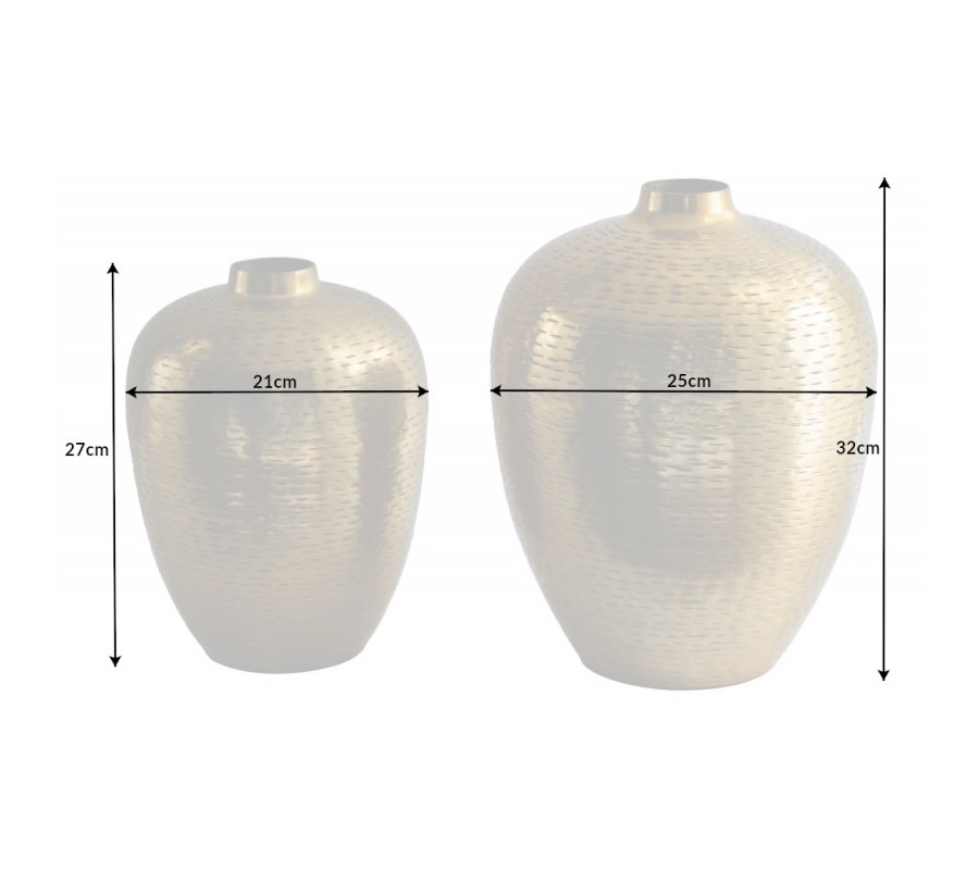 Unikátny set dvoch váz Mumbai predstavuje elegantné spestrenie dizajnových interiérov. Svoje miesto si nájde predovšetkým v orientálne ladených priestoroch, kde krásne doplní štýlovú konzolu, komodu či príručný stolík. Vázy rôznych veľkostí sú vyrobené z kovovej zliatiny a nesú sa v elegantnej zlatej farbe. Celý povrch zdobí štýlový kladivkový vzor, ktorý spolu s unikátnym zúženým tvarom vytvára jemný nádych orientálneho štýlu. Set dvoch váz Mumbai krásne doladí masívne, kovové i sklenené kúsky a vďaka žiarivému zlatému prevedeniu vynikne najmä v priestoroch ladených v tmavých odtieňoch, kde vytvorí nádherný luxusný efekt. Štýlové vázy krásne zútulnia vašu obývačku, pracovňu či predsieň a vnesú do nej ten pravý nádych domova!