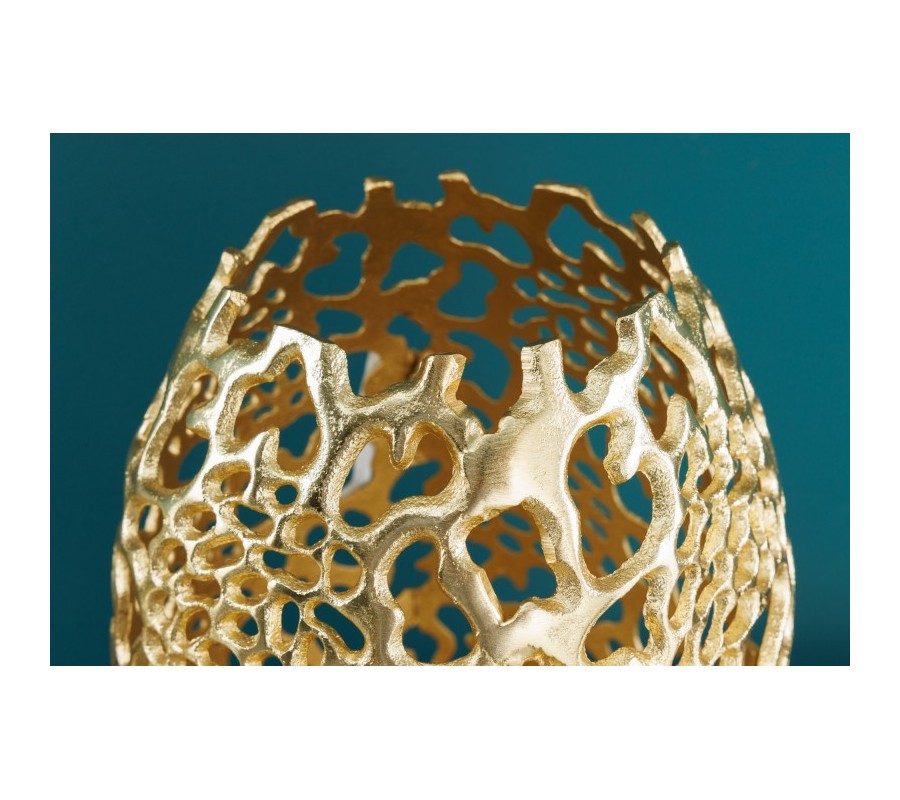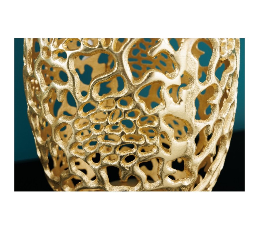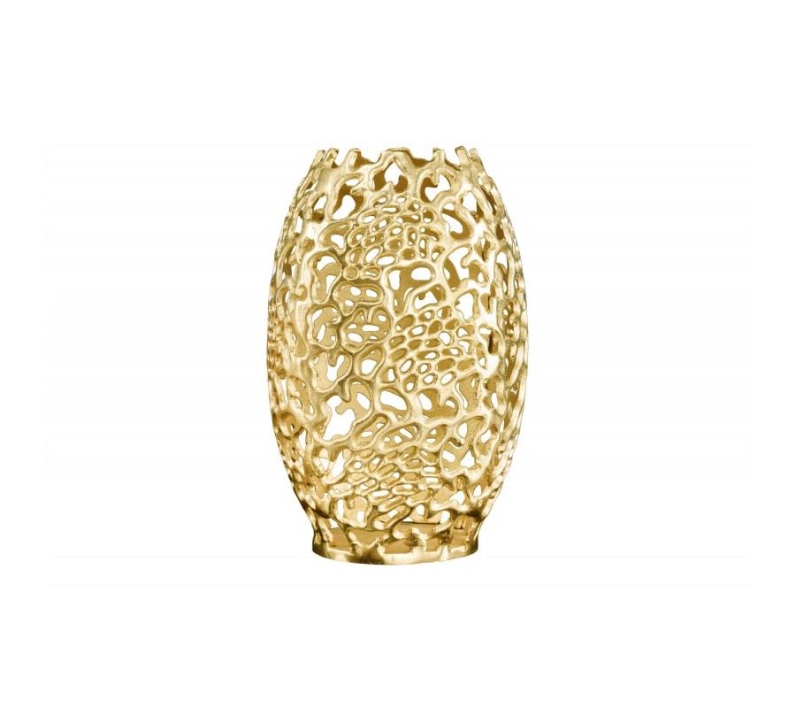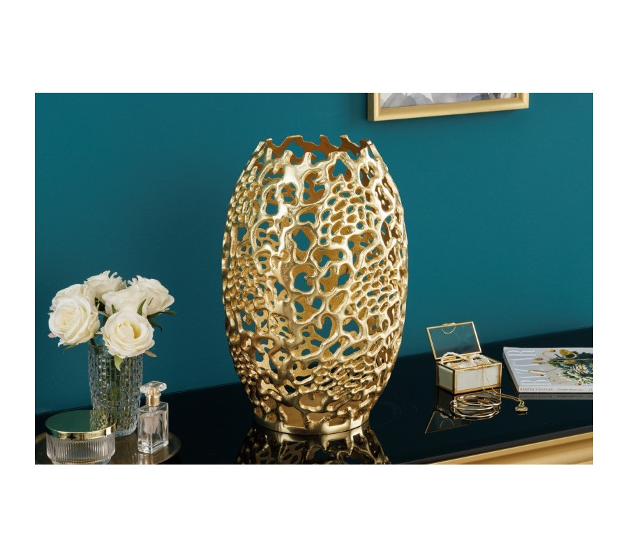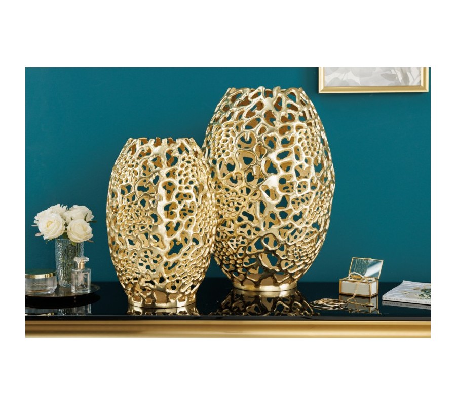 Dizajnová kovová váza Hoja je ideálna na doplnenie art deco ladenej komody, príručného stolíku či príborníku vo vašej obývačke. Tento unikátny doplnok do vašich priestorov vnesie luxusný glamour efekt, a to najmä vďaka žiarivému zlatému prevedeniu. Váza Hoja je vyrobená z kovu a tvorí ju sieťovitá konštrukcia oblých tvarov. Tento originálny vzhľad vkusne doplní tmavé mramorové, sklenené čo kovové povrchy, ktoré si žiadajú oživenie dizajnovou dekoráciou. Je tiež skvelým riešením na spestrenie hotelových izieb či art deco ladených beauty salónov. Dokonale tiež doplní rovnomenný stolík či set stolíkov Hoja!