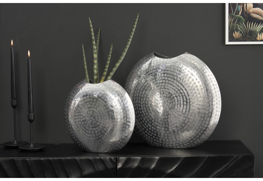 Dizajnová orientálna sada plochých okrúhlych váza Konstantino s kovaným zdobením v striebornej farbe 44 cm
