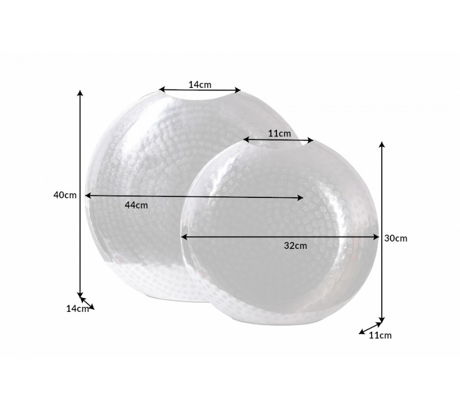 Sadu tvoria dve vázy, vyššia s výškou 40 cm a rozmermi 44x14 cm a nižšia s výškou 30 cm a rozmermi 32x11 cm. Na prvý pohľad vás zaujme pôvabný, plochý kruhový tvar, s poloblúkovým výrezom na vrchu. Sú vyrobené z kovovej zliatiny v striebornej farbe.