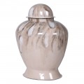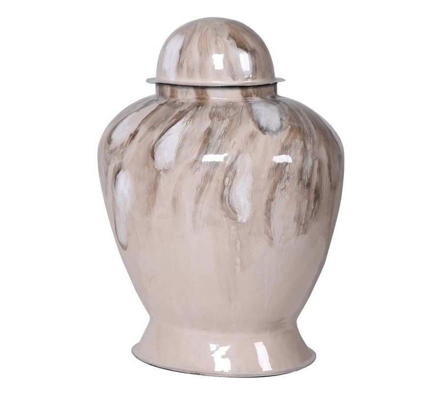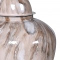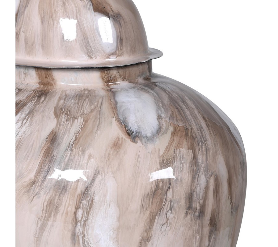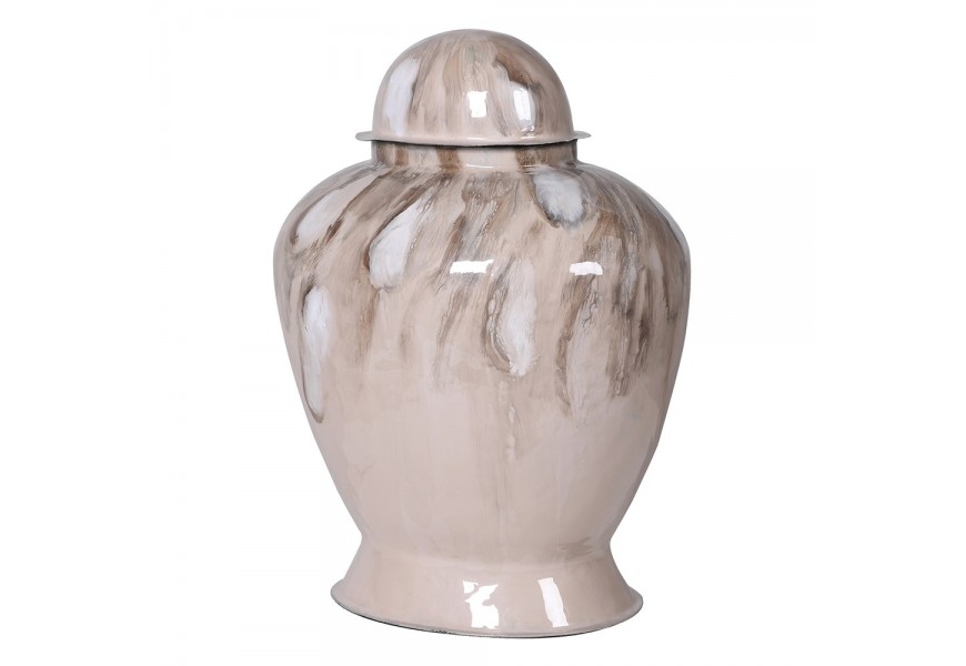 Dzajnová nádoba má výrazný, zaoblený tvar, ktorý sa v spodnej časti mierne zužuje a smerom nahor rozširuje. Vrchol nádoby je zakončený odnímateľným vrchnákom s jemne kupolovitým profilom. Povrch je hladký a lesklý, s elegantným vzorom v odtieňoch hnedej a bielej, čo vytvára zaujímavý mramorový efekt. Táto kombinácia farieb a jemných ťahov pôsobí umelecky a sofistikovane.