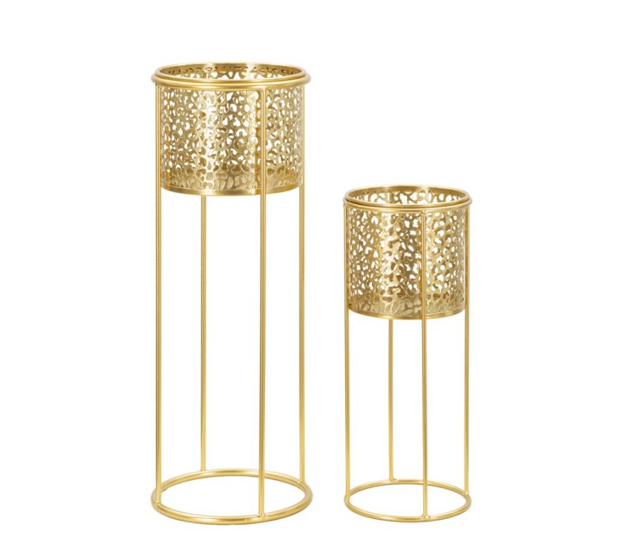 Glamour sada kovových zlatých okrúhlych kvetináčov Molan s perforovanými vzormi so stojanom