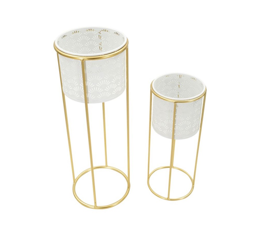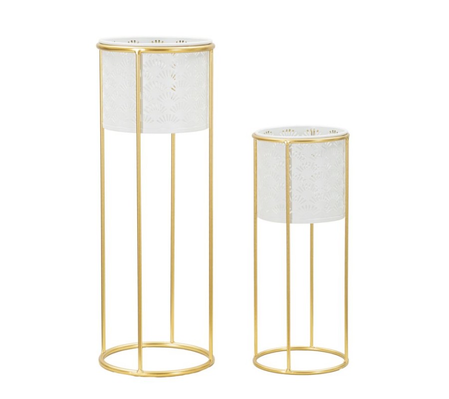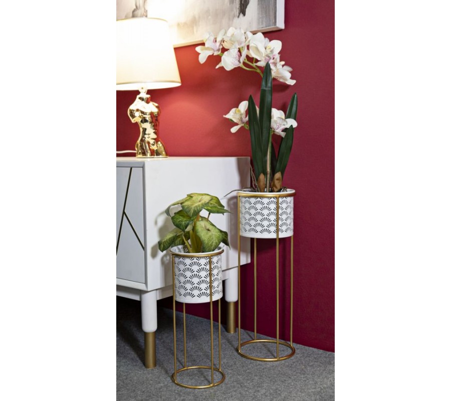 Dizajnová sada dvoch kvetináčov Oriana v glamour štýle kombinuje luxusný zlatý kovový rám s jemne perforovaným bielym držiakom, ktorý pripomína vzor mušlí. Sada obsahuje dva rôzne veľké kvetináče – vyšší variant s rozmermi 17 × 46 × 17 cm a menší s rozmermi 14 × 34 × 14 cm, čím vytvára esteticky vyváženú dvojicu, ideálnu na kombinovanie s elegantnými interiérovými doplnkami v zlatej alebo bielej farbe. Kvetináč je dekoratívny a nie je vhodný na priame zalievanie.