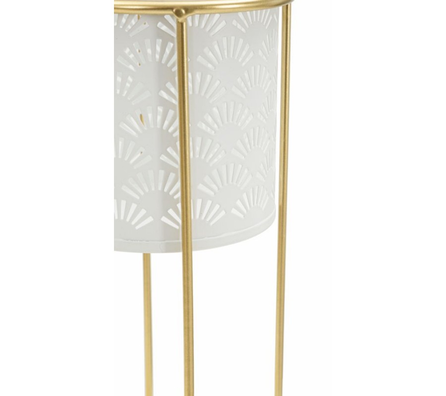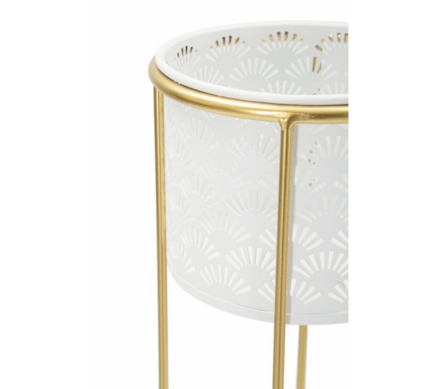 Glamour sada okrúhlych kvetináčov Oriana so zlatým kovovým rámom a bielym perforovaným držiakom s mušľovým vzorom 46 cm