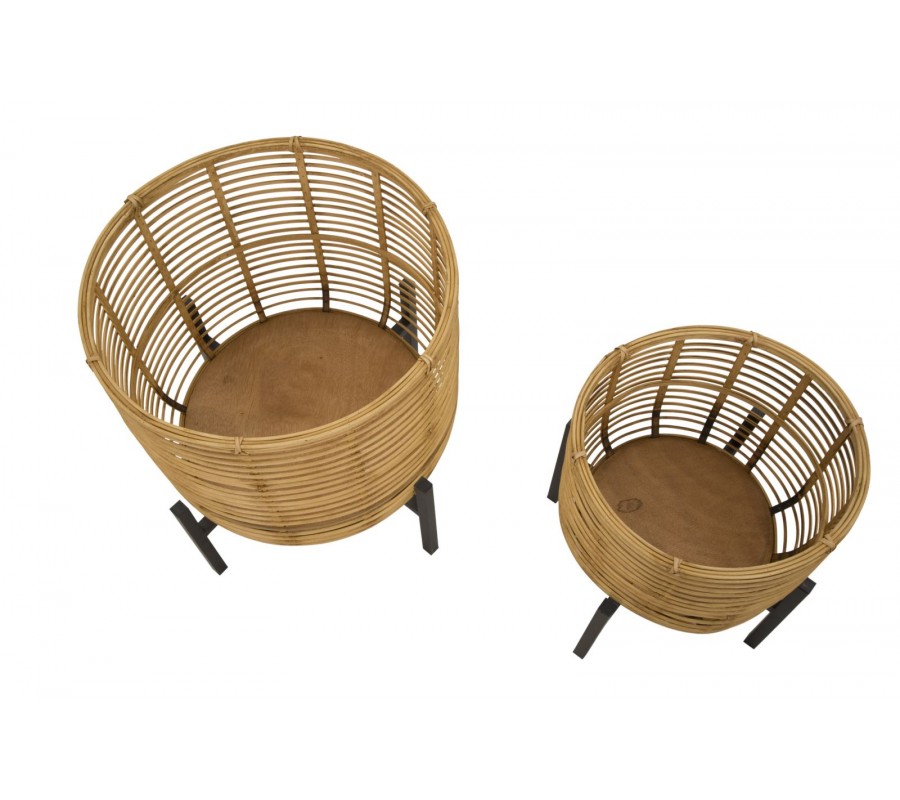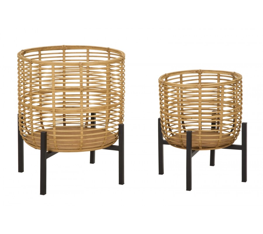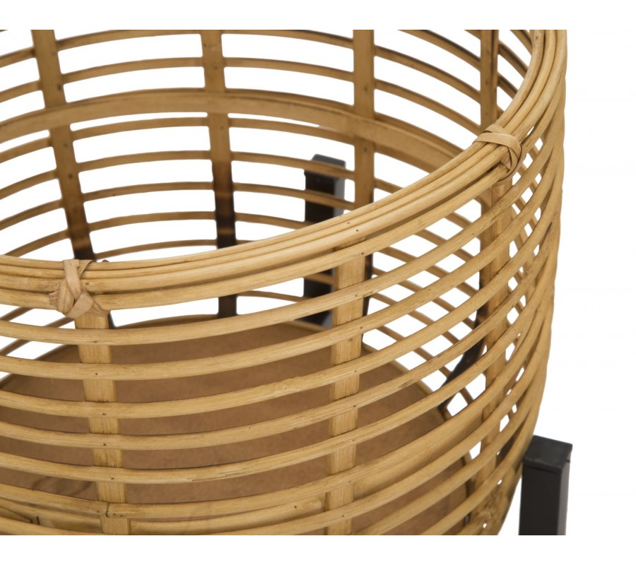 Dizajnová sada etno okrúhlych kvetináčov Amira z prírodného hnedého ratanu s čiernou kovovou konštrukciou 47 cm