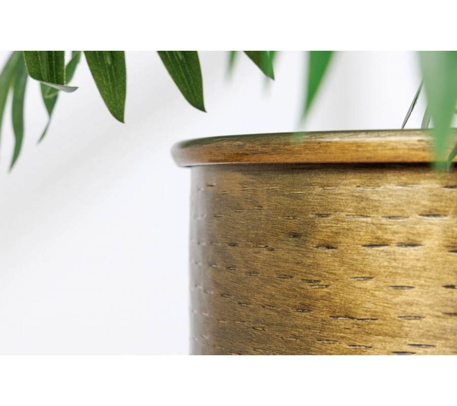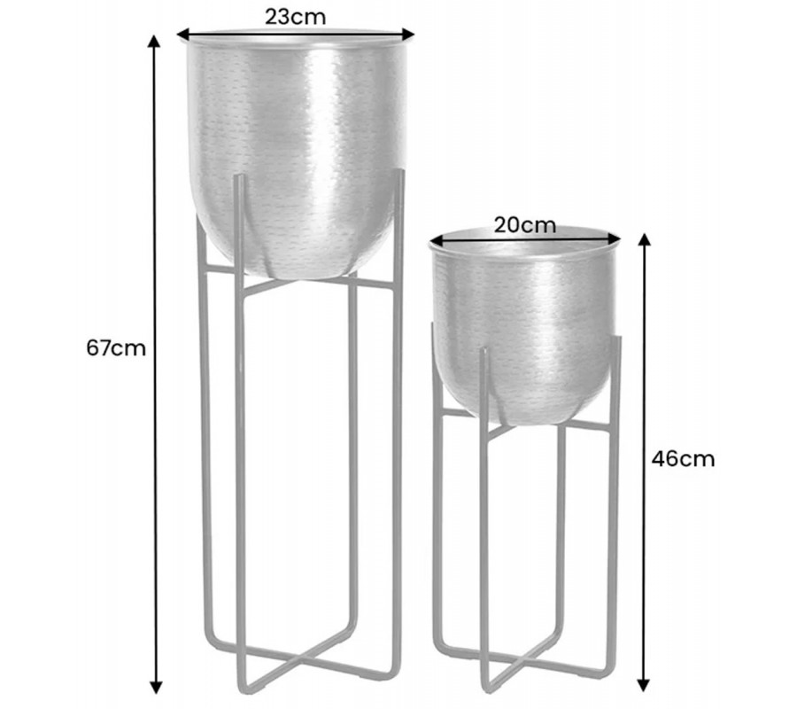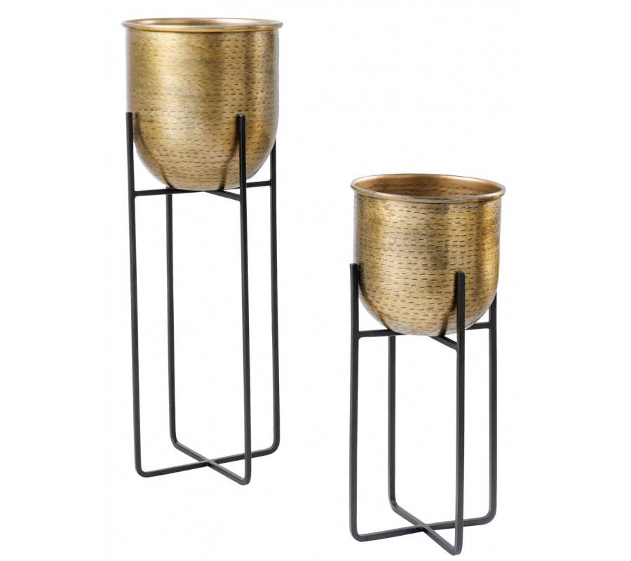 Sada dvoch kvetináčov Daris so stojanom v orientálnom štýle spája kovové prvky v kontrastnom prevedení. Kvetináče majú okrúhly tvar a sú vyrobené z kovu v zlatej farbe s detailným vybíjaným povrchovým vzorom. Tento typ zdobenia sa vytvára pomocou kladivka so štruktúrovanou hlavicou a vytvára efekt mierne nerovného kovu, ktorý pôsobí na každom kuse jedinečne.