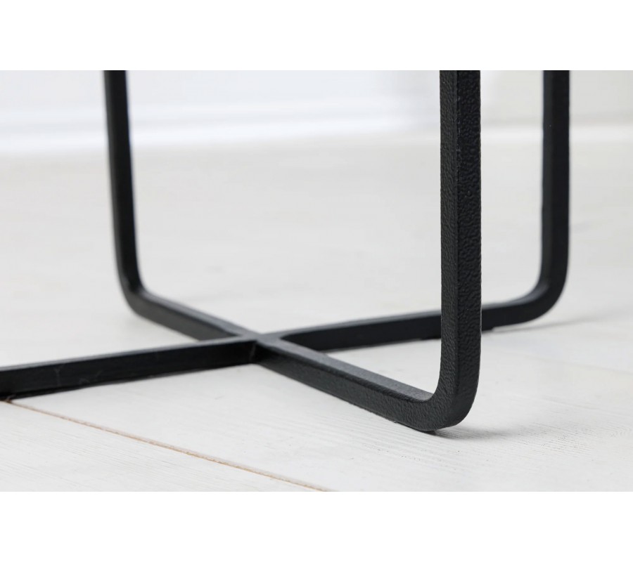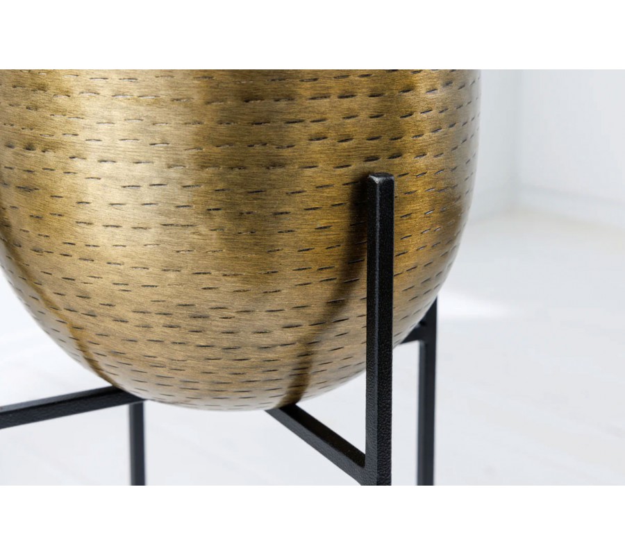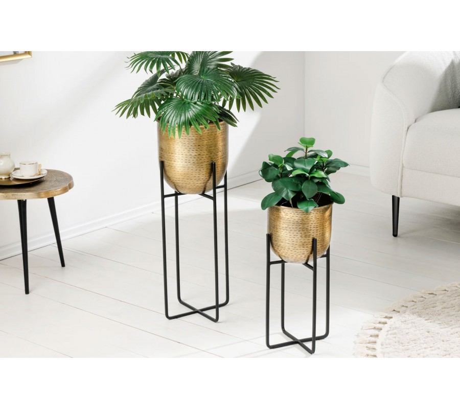 Stojan je z čierneho kovu a má geometrickú konštrukciu v tvare X, ktorá sa plynule tiahne smerom nahor. Štyri úzke kovové nohy tvoria hlavnú nosnú časť stojana, pričom pokračujú nad okraj a vytvárajú oporu pre kvetináč, aby zostal pevne fixovaný. Tento kontrast medzi zlatým povrchom kvetináčov a čiernym kovovým rámom dodáva celej sade moderný a štýlový vzhľad.