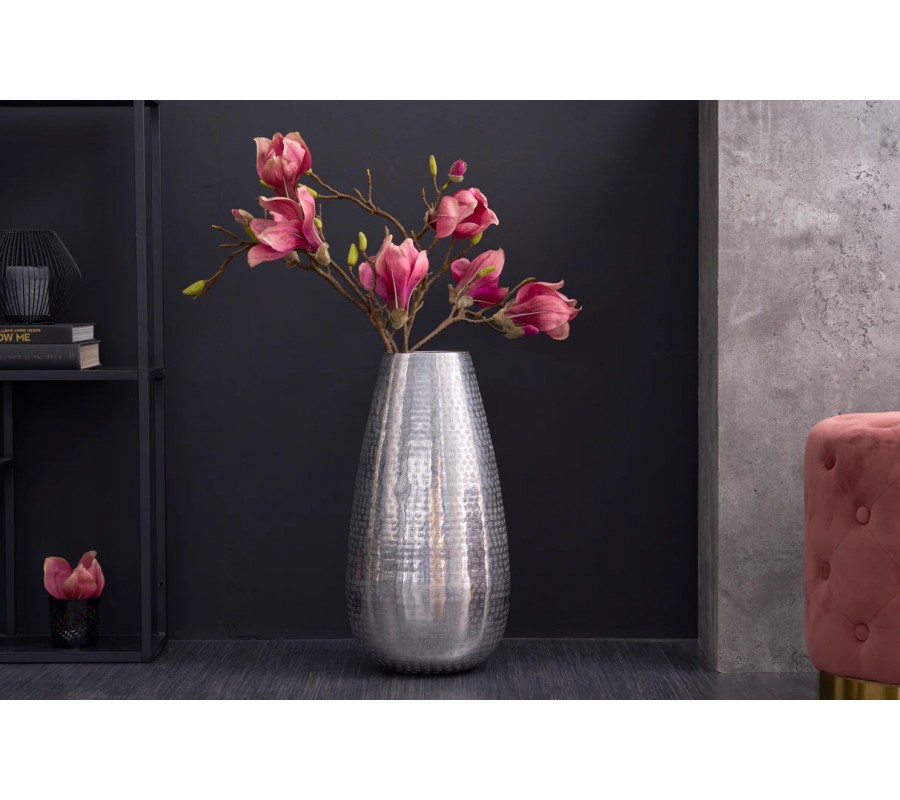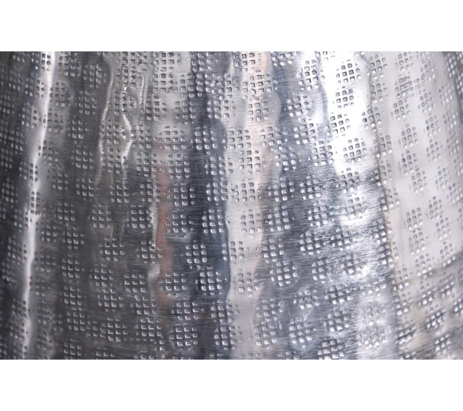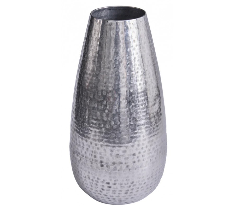 Váza Mara je elegantným príkladom orientálneho remeselného spracovania, ktoré kombinuje tradičné techniky s moderným dizajnom. Je vyrobená z kovovej lietiny. Vysoké oblé telo vázy vyniká svojím jemne zužujúcim sa tvarom, ktorý plynule prechádza do okrúhleho otvoru. Povrch je zdobený jemným vybíjaním v pravidelných geometrických vzoroch, ktoré dodávajú váze výraznú hĺbku a originálny charakter. Vybíjaný vzor je bodový a pripomína techniku zdobenia kladivkom s textúrovanou hlavicou. Strieborná farba s vysokým leskom opticky zväčšuje priestor a dodáva interiéru svieži a luxusný nádych.