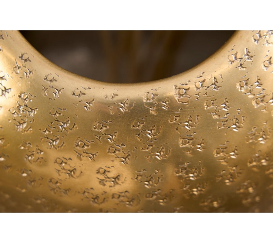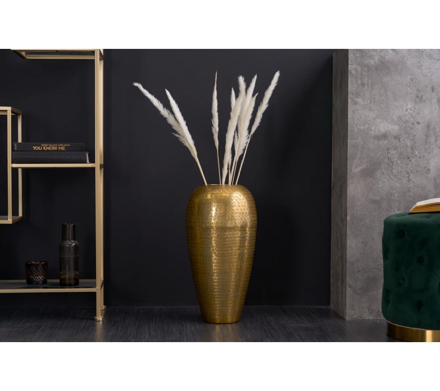 Vysoká váza Mara je pôsobivý orientálny doplnok so zlatým kovovým povrchom, ktorý zdobia jemné štruktúrované vybíjané vzory po celej ploche. Vybíjaný vzor je bodový a pripomína techniku zdobenia kladivkom s textúrovanou hlavicou. Je vytvorená v elegantnom oblom tvare, ktorý prechádza do okrúhleho otvoru, čím pôsobí harmonicky a luxusne. Vysoký lesk a detailné spracovanie zdôrazňujú jej dekoratívny charakter. Spodná časť je užšia a vrchná rozšírená