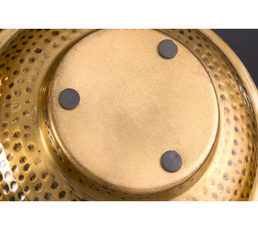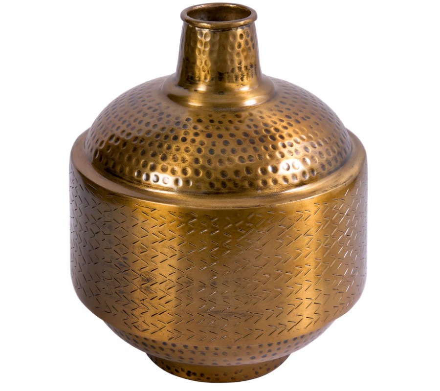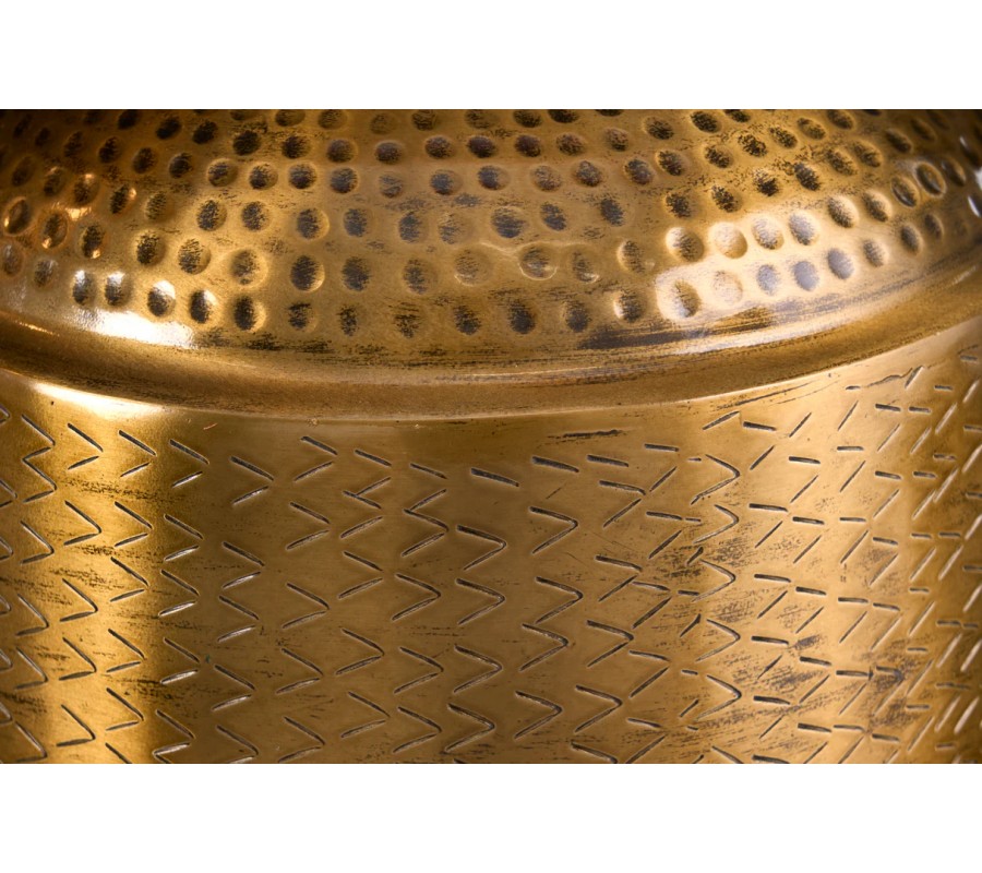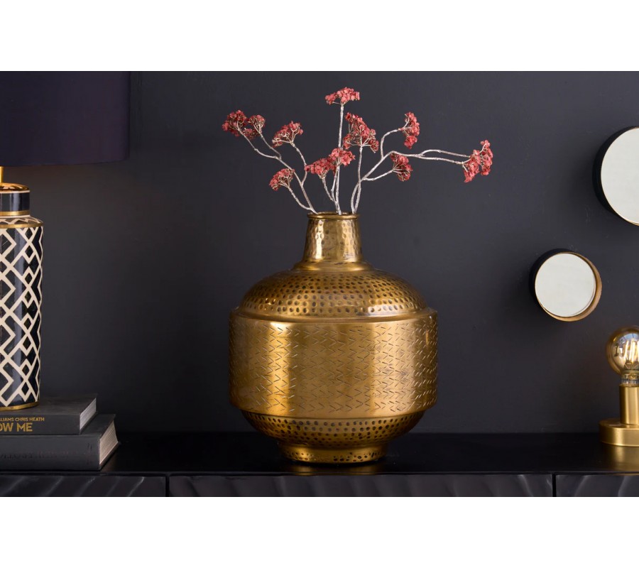 Glamour váza Aleny v orientálnom štýle okamžite upúta pozornosť svojim výrazným valcovitým tvarom s jemne zaobleným dnom a elegantne sa zužujúcim úzkym hrdlom s malým okrúhlym otvorom. Vyrobená je z kvalitného kovu v bohatej zlatej farbe, ktorá v kombinácii s lesklým povrchom dodáva váze luxusný a sofistikovaný vzhľad. Horná a dolná časť vázy je zdobená hustým bodkovaným vybíjaním, zatiaľ čo stredná a dolná časť prechádza do jemného rytého vzoru vytvoreného z geometrického vzoru šípok, ktoré vytvárajú dojem pohybu a elegantnej dynamiky. Štruktúrovaný povrch vázy zachytáva svetlo pod rôznymi uhlami a zvýrazňuje jej trblietavý efekt, vďaka čomu sa stáva skutočnou dominantou v priestore.