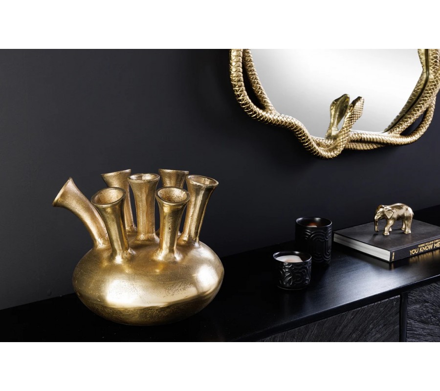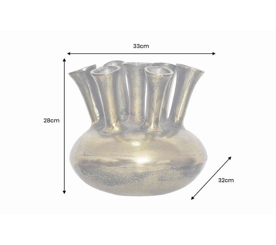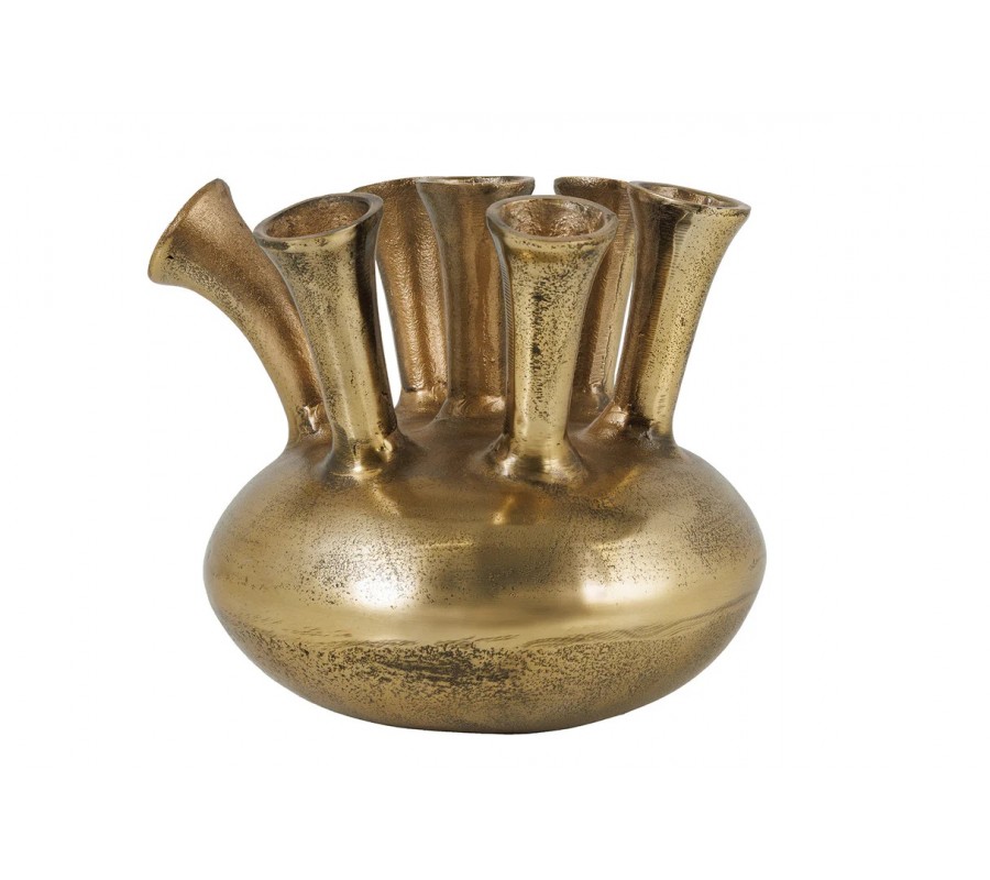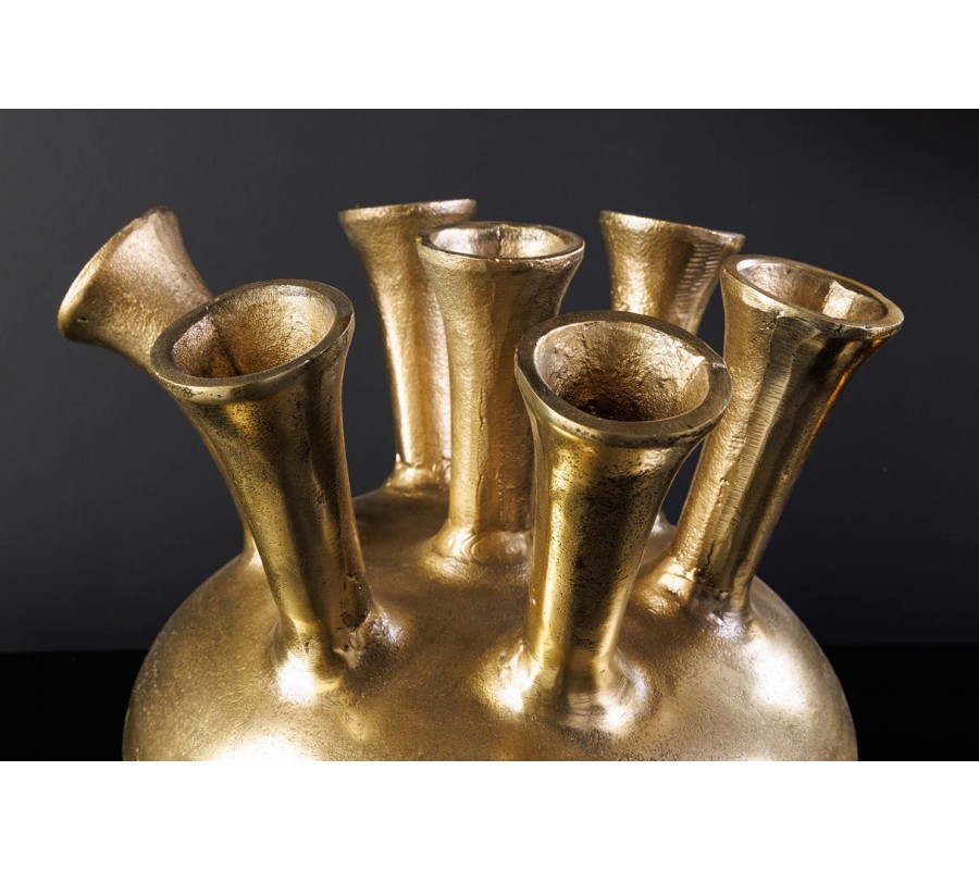 Váza Nova je dizajnový kúsok, ktorý zaujme svojím umeleckým prevedením a zlatým leskom s patinou. Jej okrúhla základňa z kovu pôsobí stabilne a mohutné, pričom z nej asymetricky vyrastá sedem valcových hrdiel, ktoré sú smerom von jemne zahnuté a majú rôznu výšku aj natočenie. Tento netradičný tvar vytvára z vázy Nova umelecký objekt, ktorý pripomína sochu s organickými prvkami.