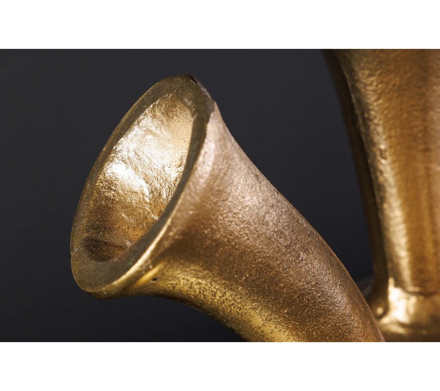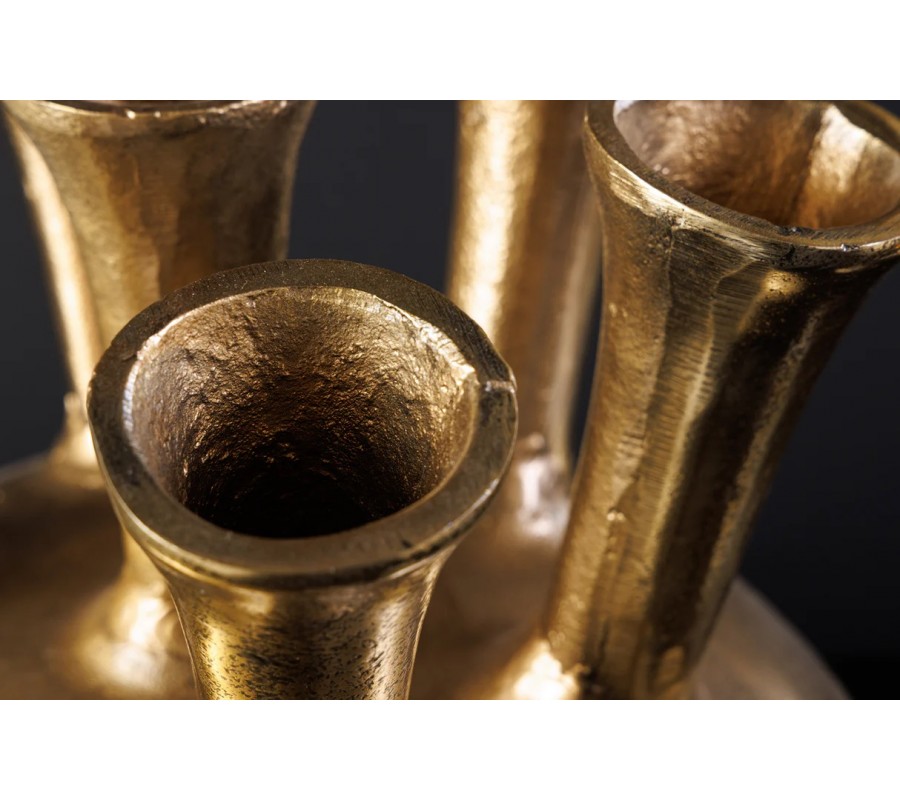 Povrch vázy je jemne štruktúrovaný patinou, čo zvýrazňuje zlatú farbu a dodáva jej historický či až starožitný výraz. Každý otvor je samostatný a umožňuje vloženie niekoľkých kvetov či vetvičiek – vynikne najmä so sušenými kvetmi, okrasnými trávami alebo minimalistickými aranžmánmi.