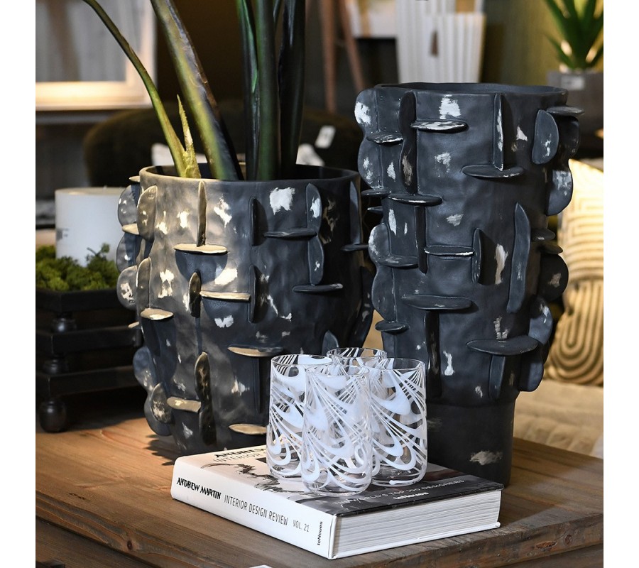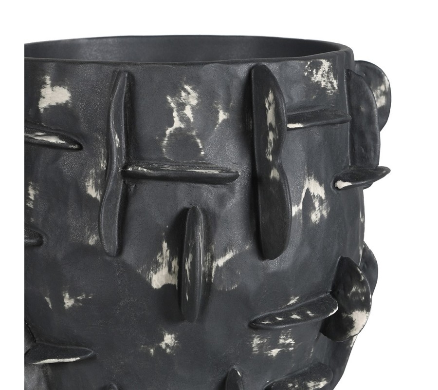 Art deco okrúhla čierna porcelánová váza Saphira so sivou patinou a plastickými výbežkami 25 cm