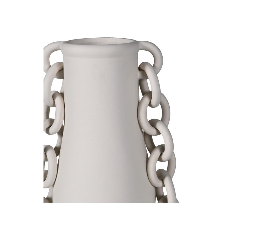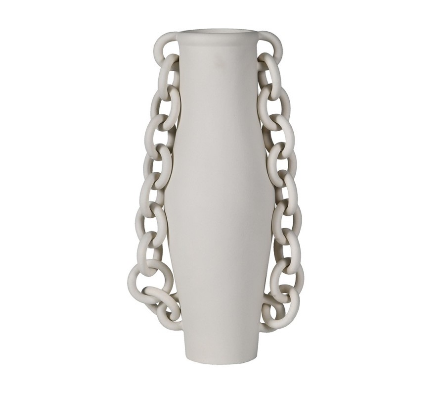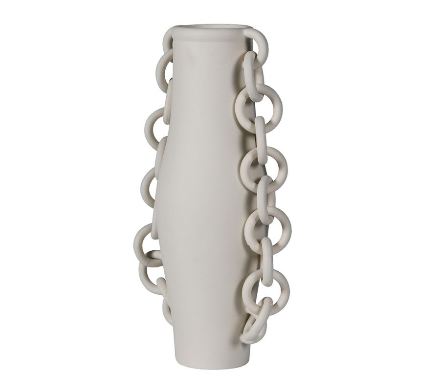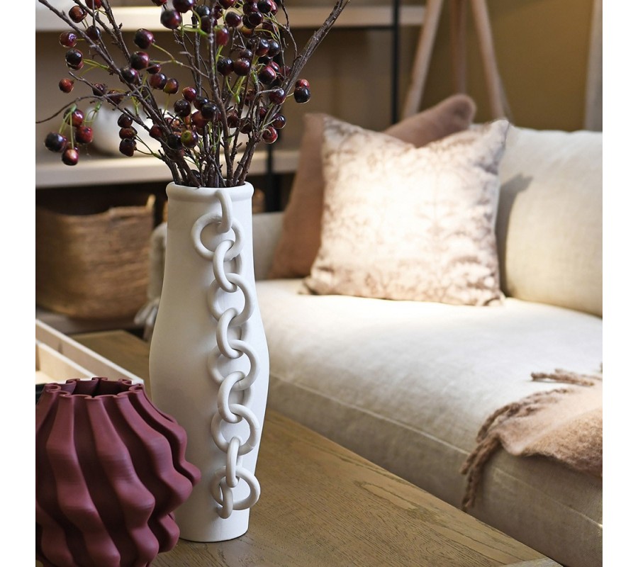 Moderná váza Chain je originálnym interiérovým doplnkom, ktorý zaujme na prvý pohľad. Vyrobená je z porcelánu v matne sivej farbe, ktorá pôsobí elegantne a nadčasovo. Jej štíhly, jemne zaoblený tvar zdobia po oboch stranách porcelánové dekoratívne reťaze, vďaka ktorým získava váza unikátny umelecký charakter.