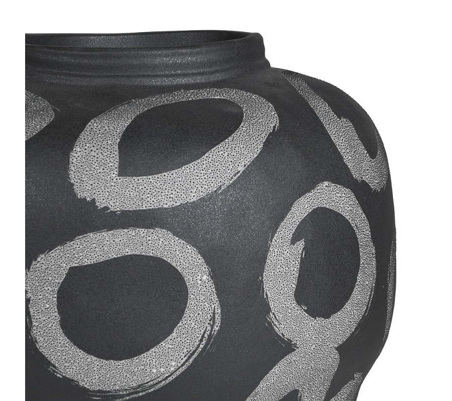 Dizajnová moderná porcelánová váza Loop v čiernej farbe s dekoratívnymi kružnicami v sivej farbe 36 cm