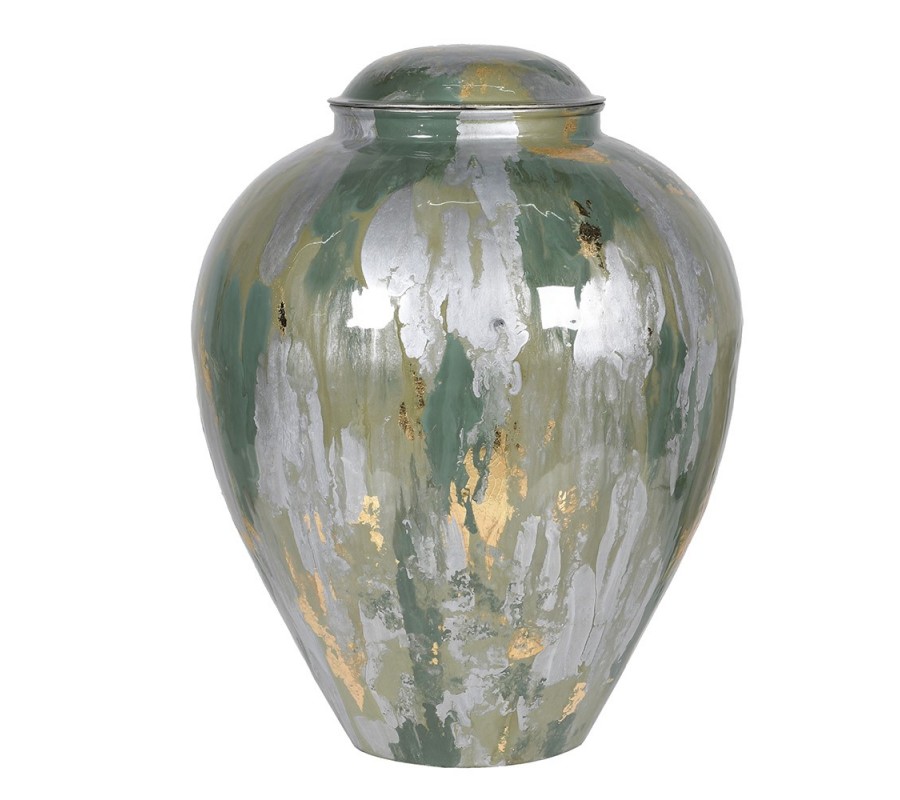 Povrch vyniká abstraktným vzorom v kombinácii striebornej, zelenej a žltej farby, ktoré sa prelínajú do umeleckého efektu, pripomínajúceho ručnú maľbu. Vďaka lesklému prevedeniu váza pôsobí luxusne a okamžite upúta pozornosť.