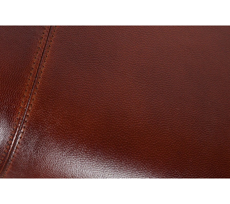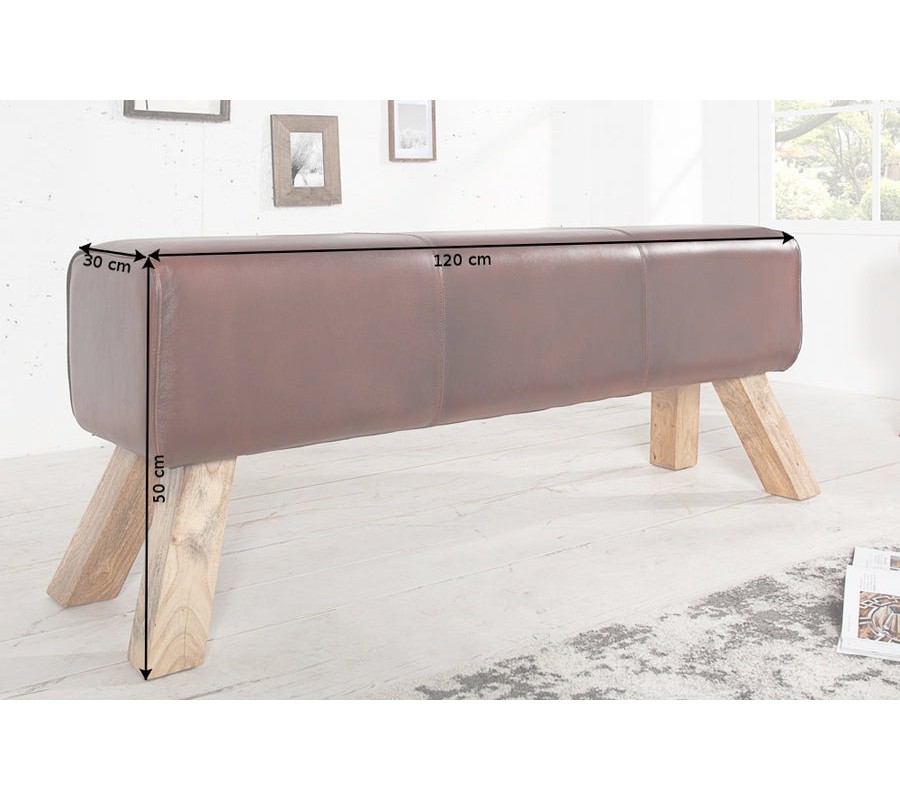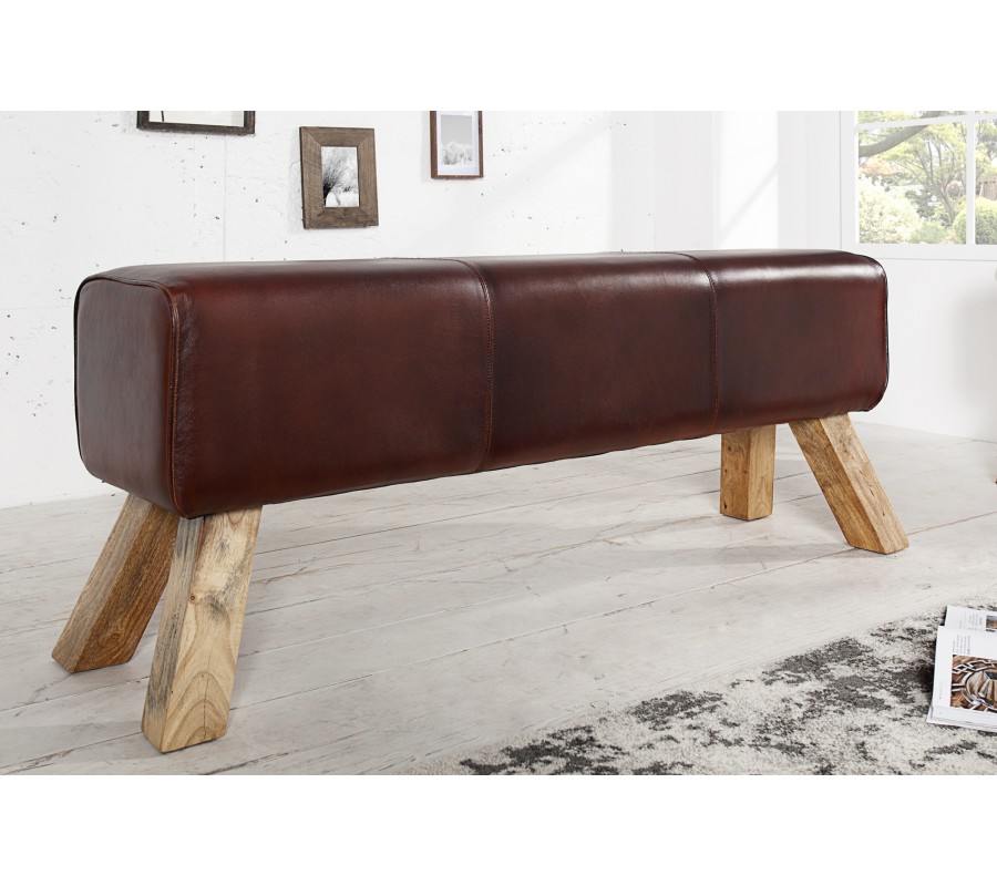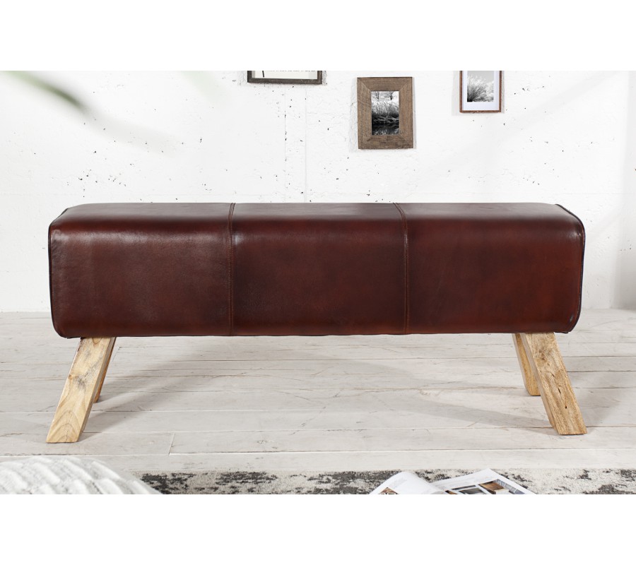 Vidiecka dvojmiestna lavica Bock s poťahom z pravej červenohnedej kože a drevenými nožičkami v hranatom tvare 120 cm