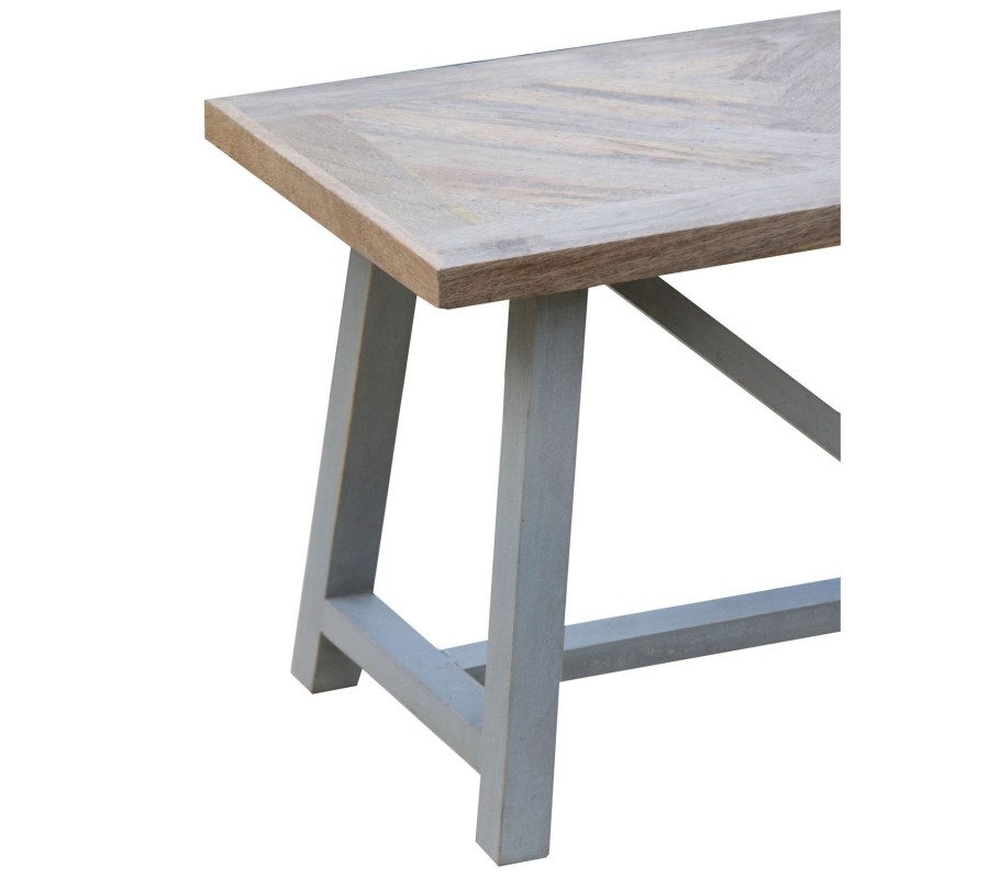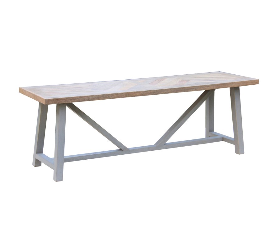 Dizajnová jedálenská lavica z kolekcie industriálneho nábytku Nyakim je unikátna vďaka povrchovej úprave či už nožičiek alebo vrchnej svetlo hnedej sedacej časti. Masívne drevo vrchnej dosky je vyzdobené parketovým vzorom z viacerých dosiek, čo vytvára industriálny dojem a kovovo pôsobiace svetlo sivé drevené nožičky sú upravené aby po rohoch vytvorili prirodzené opotrebovanie dreva s nádychom vintage štýlu. Vďaka bohatému rozmeru 200cm sa pohodlne usadíte za jedálenským stolom a vďaka svetlému farebnému prevedeniu sa dá jedálenská lavica Nyakim ľahko kombinovať do škandinávskych alebo svetlých industriálnych jedální