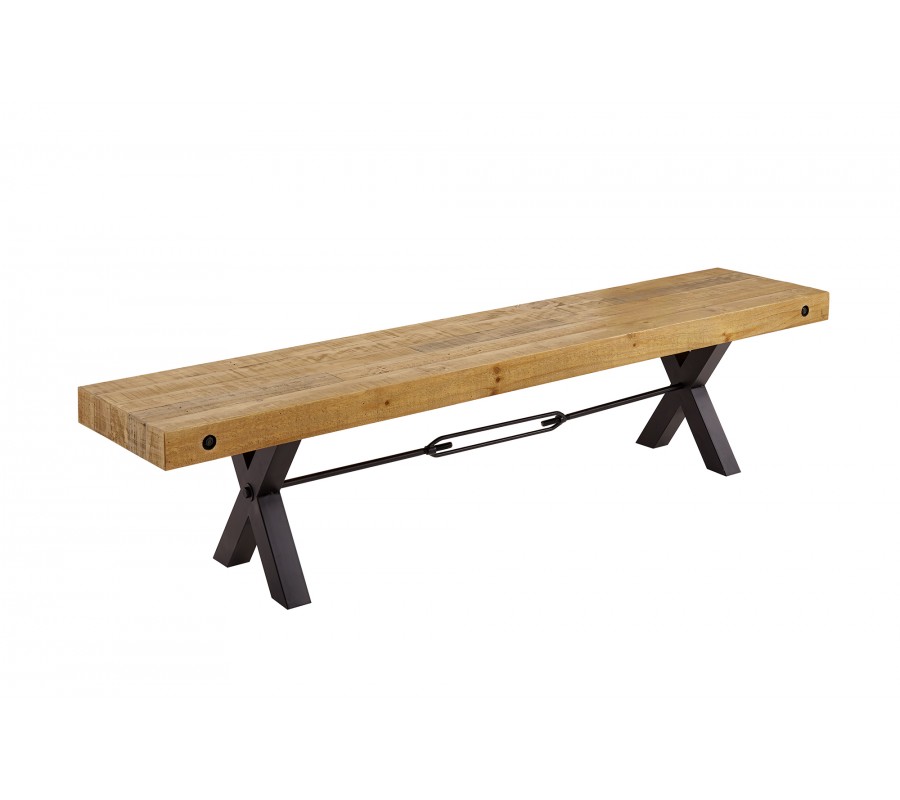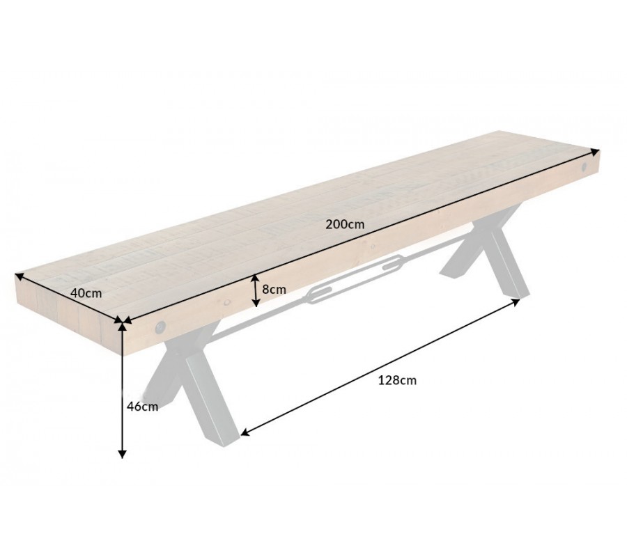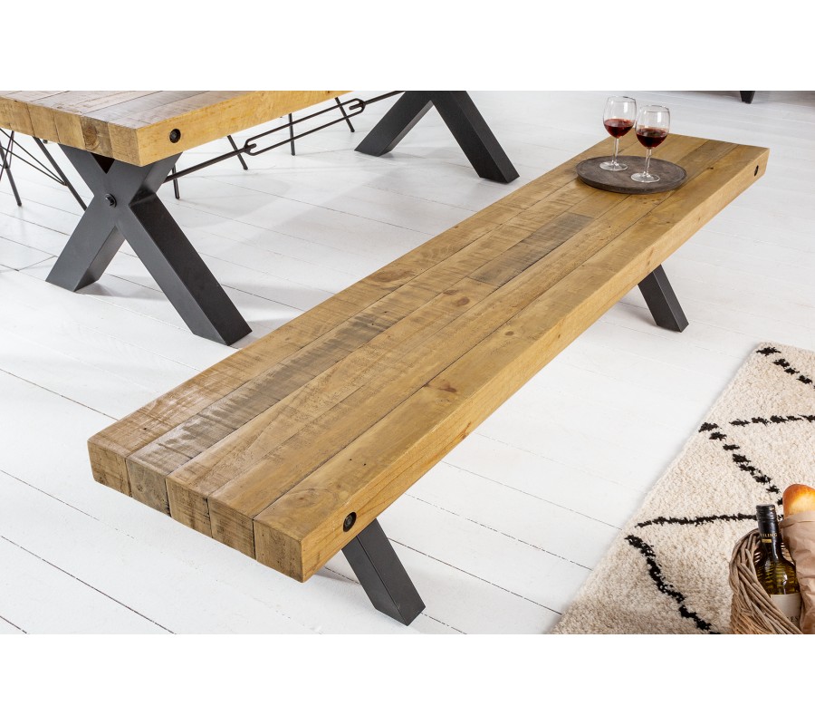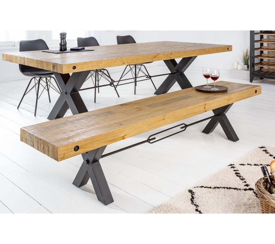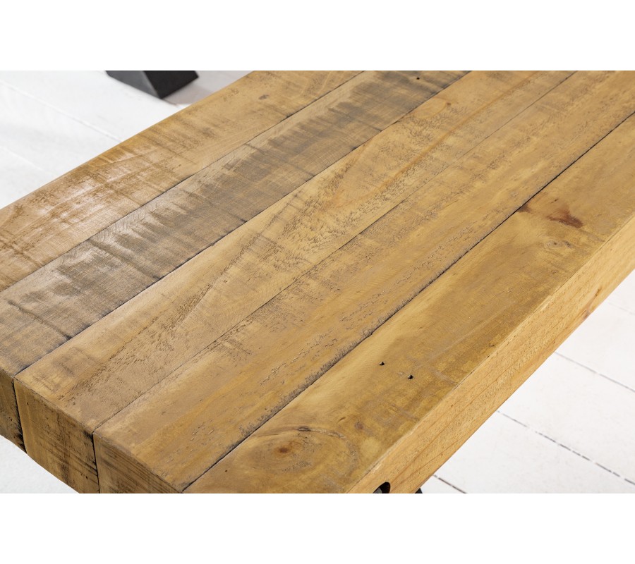 Industriálna lavica Freya z masívneho dreva vo farbe vintage hnedej s čiernymi kovovými obdĺžnikovými nožičkami 200 cm