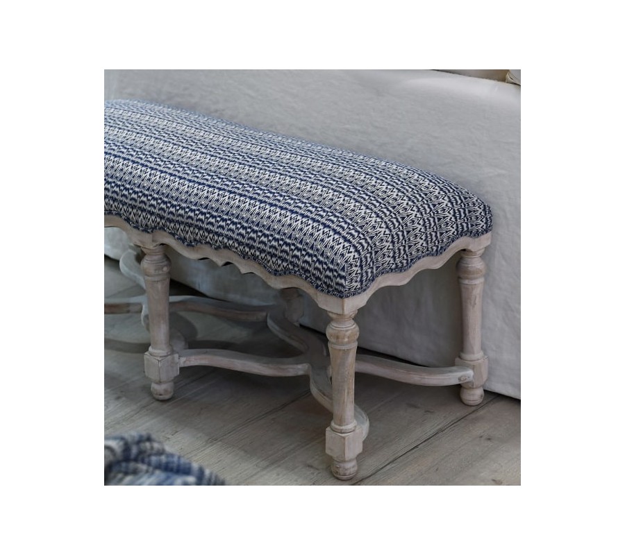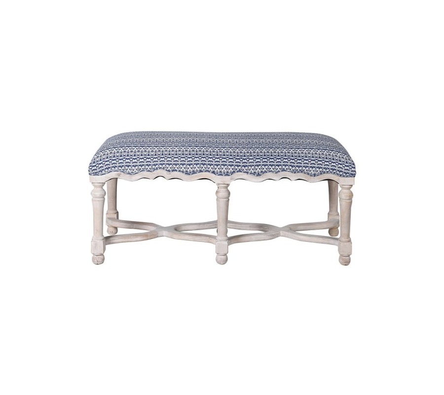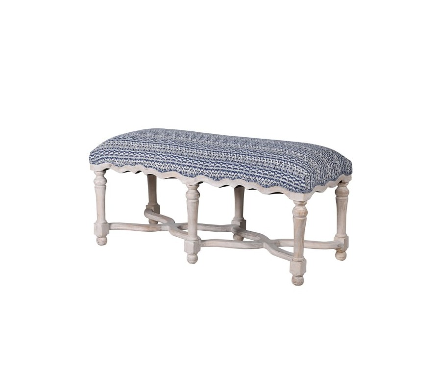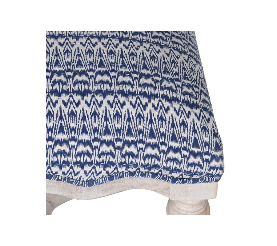 Čalúnenie lavice je vyrobené z kvalitnej bavlny s modro bielym vzorovaním, ktoré pripomína geometrický alebo etno štýl. Vzor je pútavý, no zároveň jemný, čo umožňuje lavici jednoducho zapadnúť do rôznych interiérov.