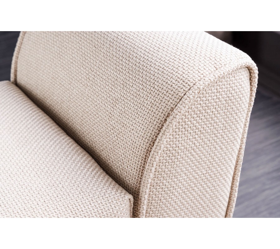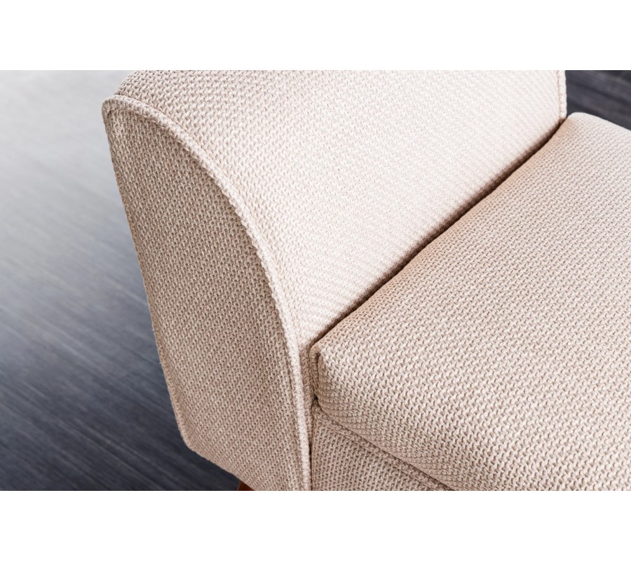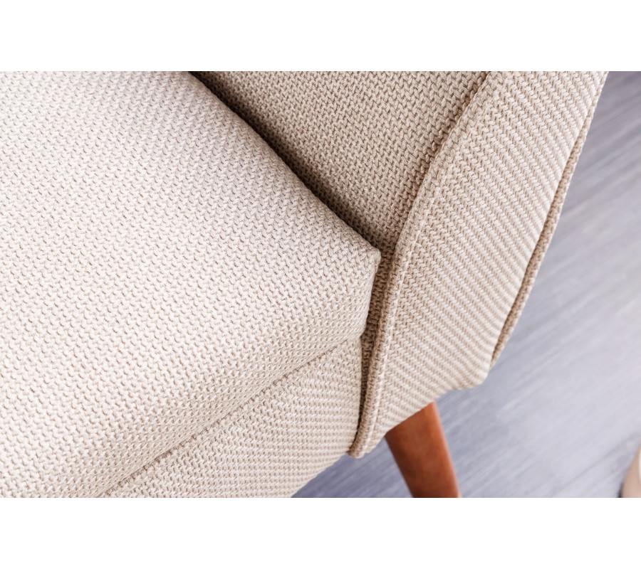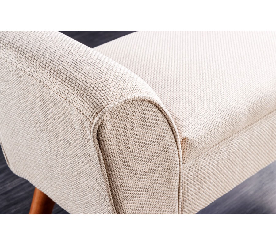 Elegantná lavica Karen vyniká svojím poťahom v béžovej farbe s výrazným tkaním, ktoré jej dodáva mäkký a príjemný povrch na sedenie. Sedacia časť je bohato čalúnená penovou výplňou, čo zaručuje vysoký komfort, pričom na jej bokoch sa nachádzajú zaoblené opierky na ruky, ktoré umocňujú sofistikovaný vzhľad.