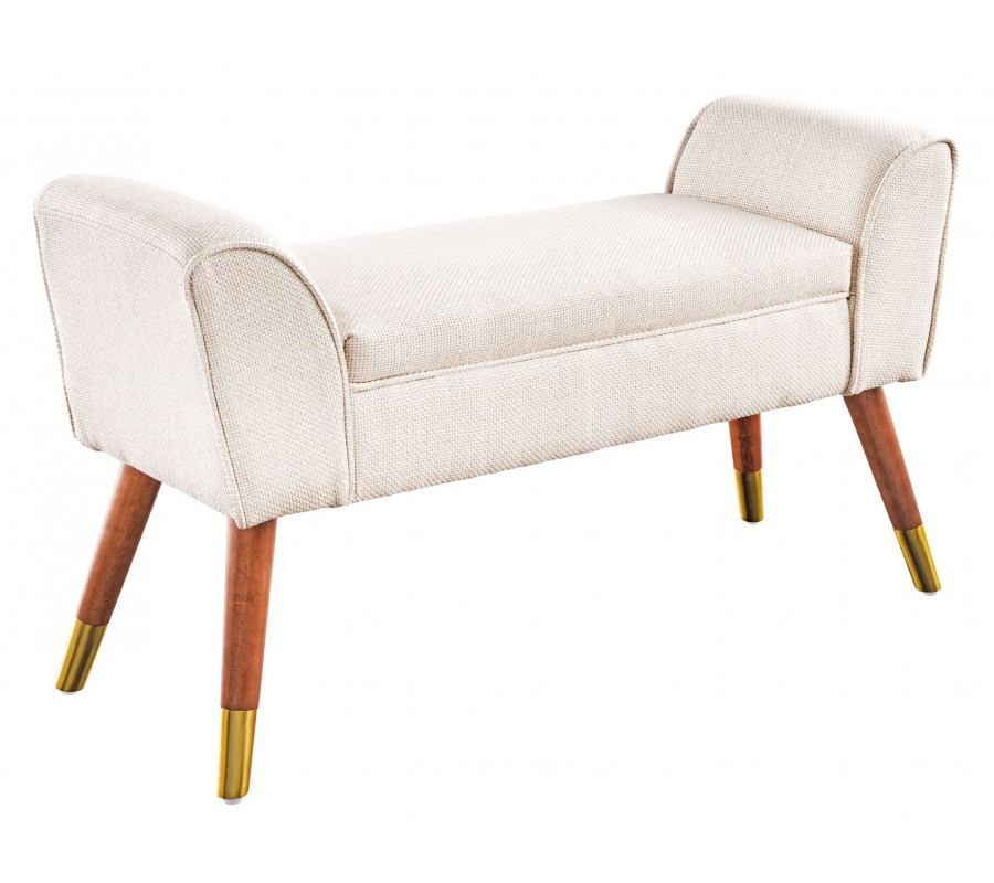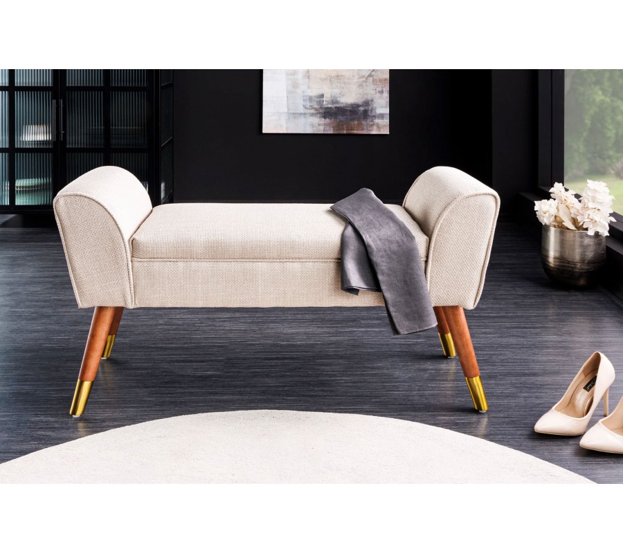 Kombinácia béžovej látky a lesklých zlatých prvkov robí z tejto lavice všestranný doplnok do moderných a glamour interiérov. Perfektne zapadne do spálne k posteli, do predsiene ako dizajnový akcent či do obývačky k čalúnenému kreslu alebo pohovke v podobnom tóne. Skvelo sa kombinuje s doplnkami v zlatej, krémovej alebo hnedej farbe.
