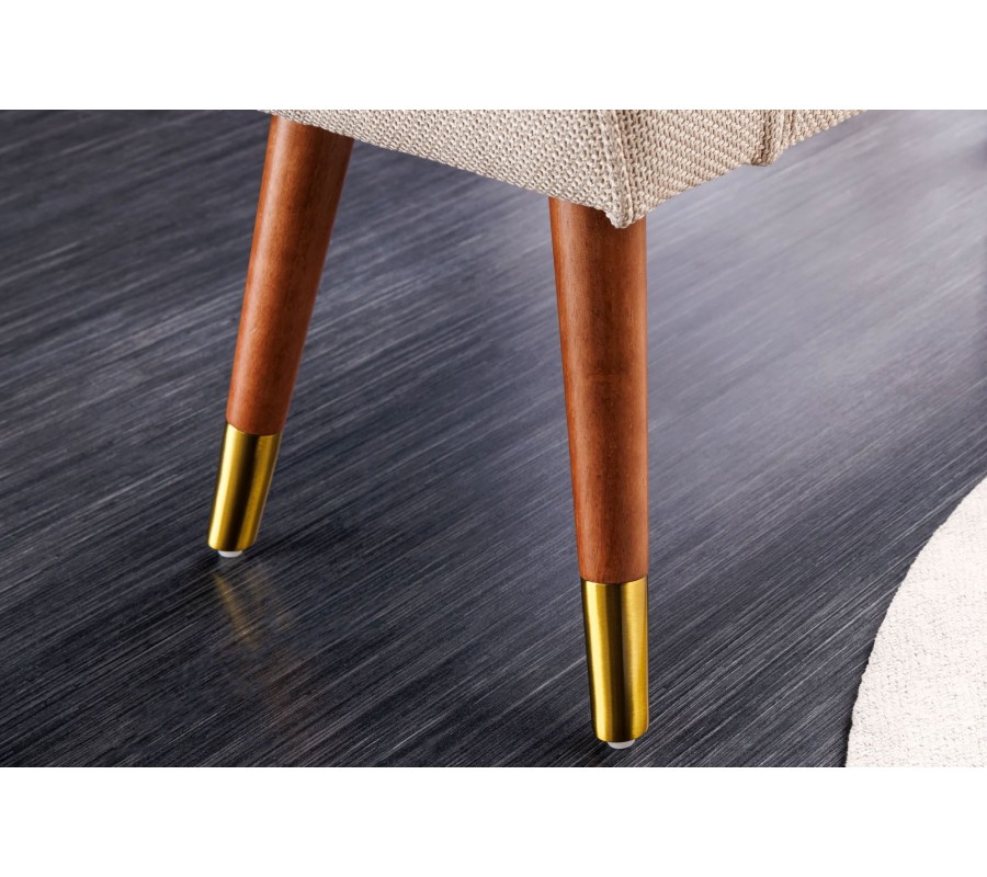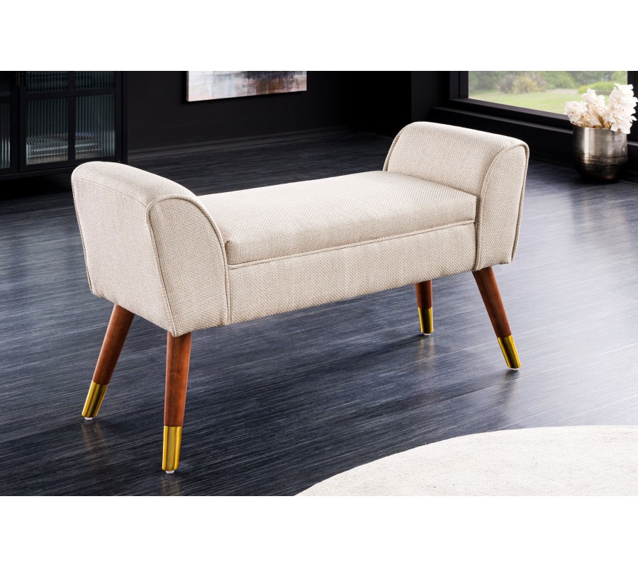 Dizajnová art deco lavica Karen s béžovým čalúnením a hnedými drevenými nohami so zlatými detailmi 90 cm